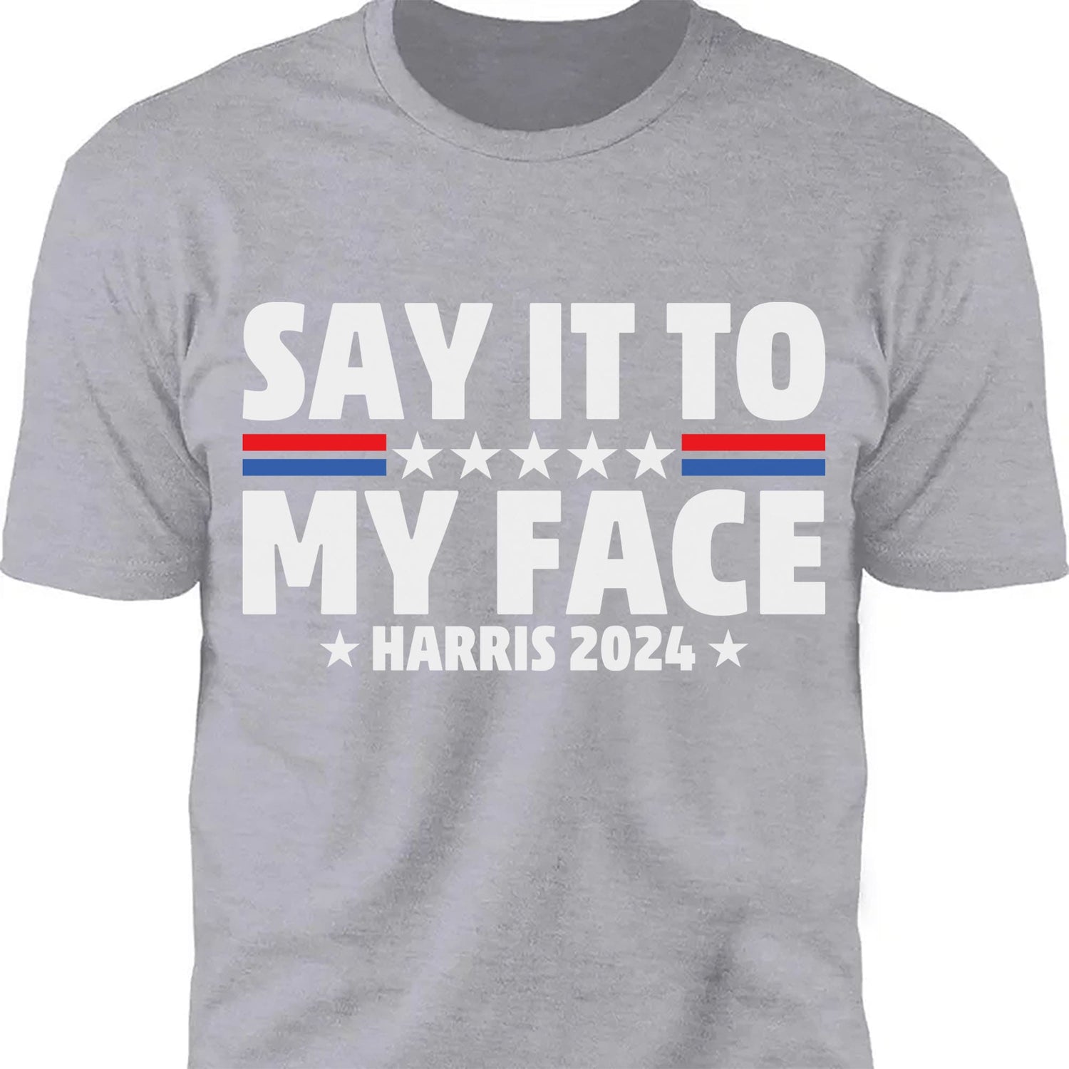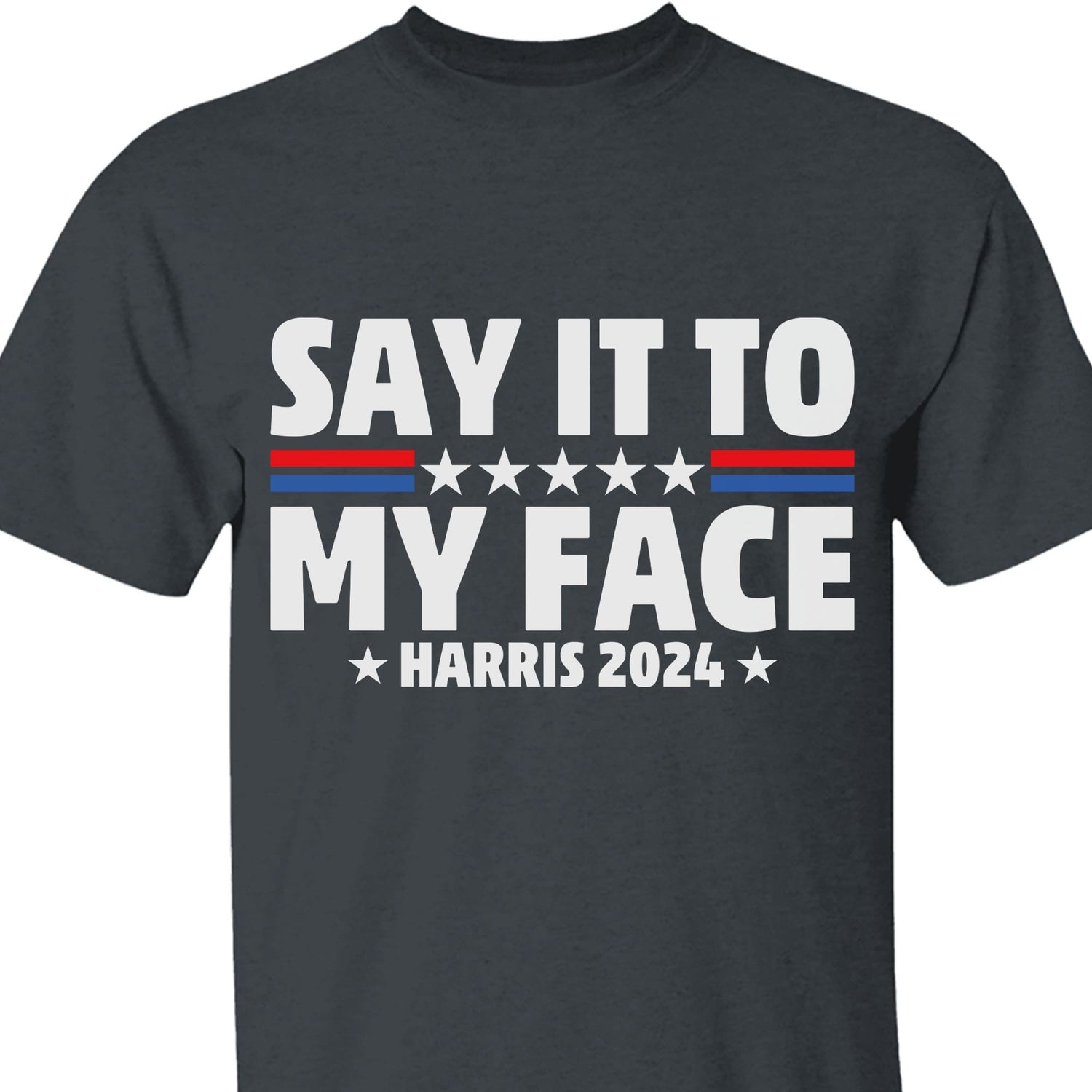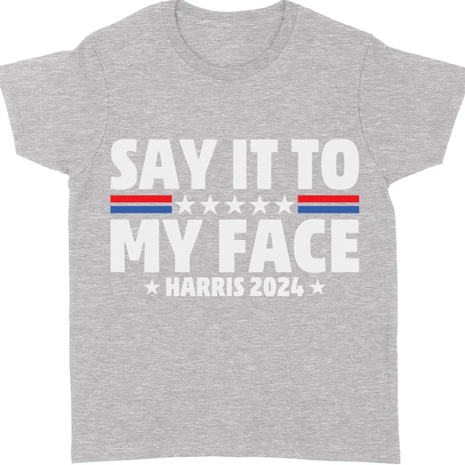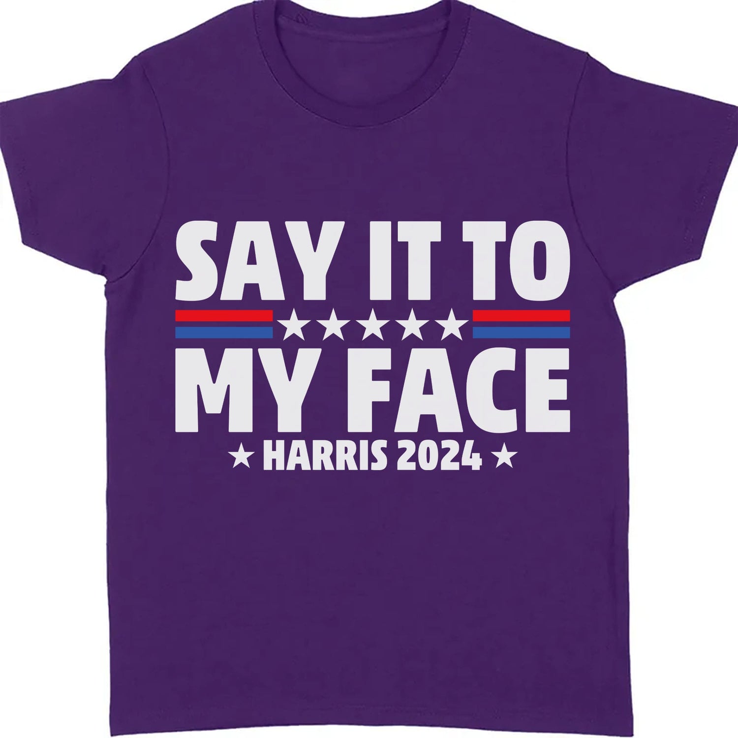 This dynamic t-shirt design delivers a strong message with style. The bold phrase "Say it to my face" is prominently displayed, with a striking line between "say it to" and "my face." The line is a combination of a red and blue line, divided in the center by five stars, which are arranged to create a sense of balance and unity. Below this powerful statement, the words "Harris 2024" are featured, framed by two stars on either side, adding a patriotic touch. This design is perfect for those who want to make a statement with their fashion, combining political support with a confident attitude.