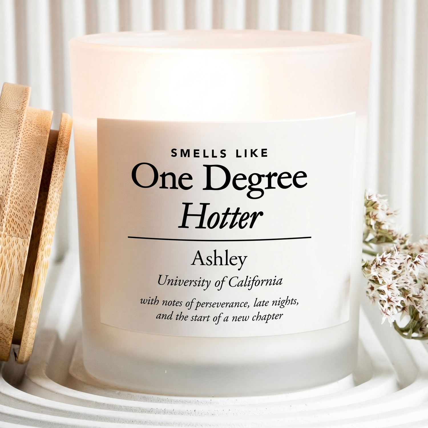 Celebrate their impressive achievement with a thoughtful and humorous gift that perfectly captures their hard work: a personalized graduation candle. The charming label playfully states that the recipient is now "One Degree Hotter," and can be customized with their name and specific university, making it a unique keepsake for their big milestone. Hand-poured in an elegant frosted glass jar with a natural bamboo lid, this beautiful piece features a generous 40-hour burn time, measuring 3.15 inches by 3.75 inches to perfectly accent any desk or dorm room. Featuring whimsical "fragrance notes" like perseverance, late nights, and the start of a new chapter, it is the perfect way to light up their future and show how proud you are of their accomplishments.
