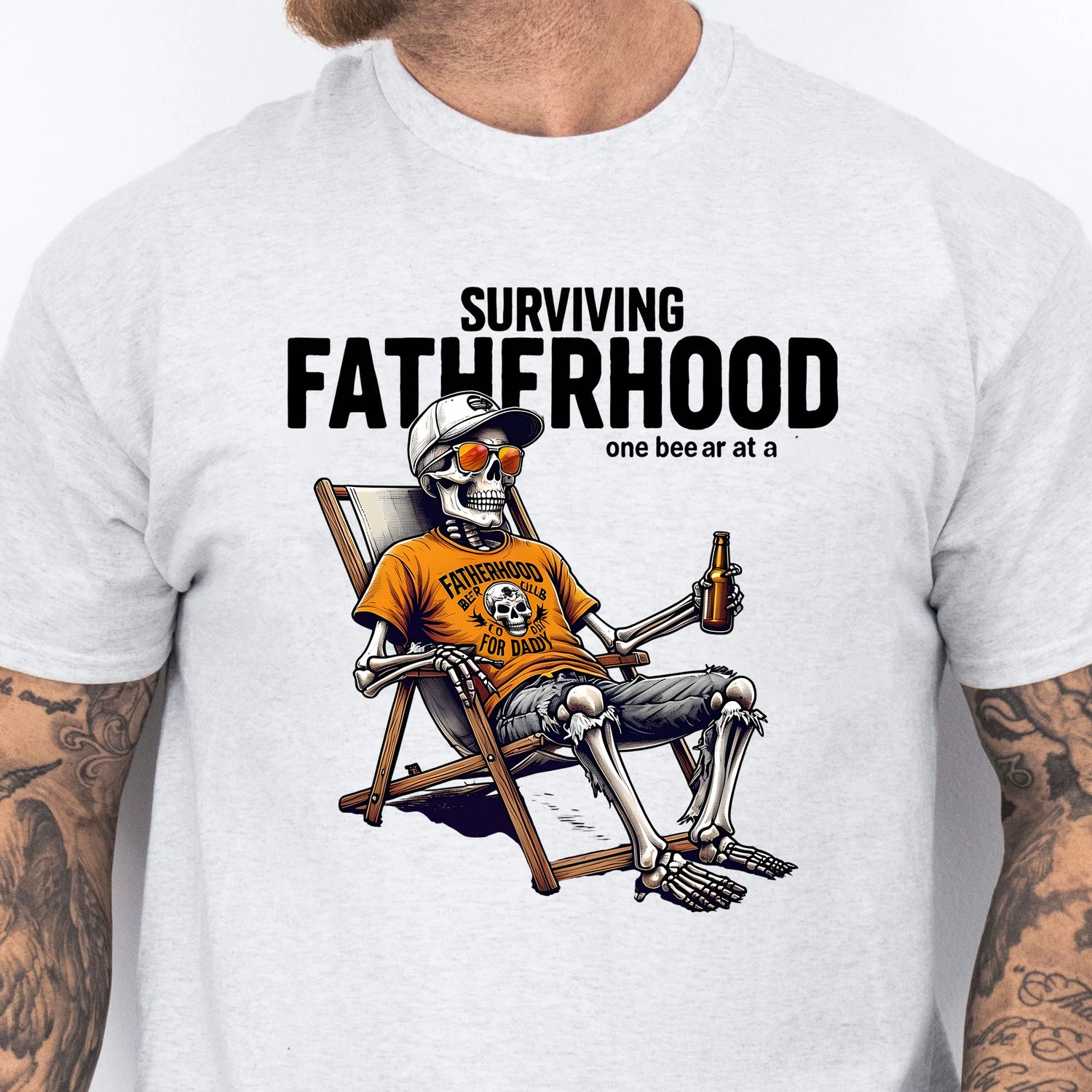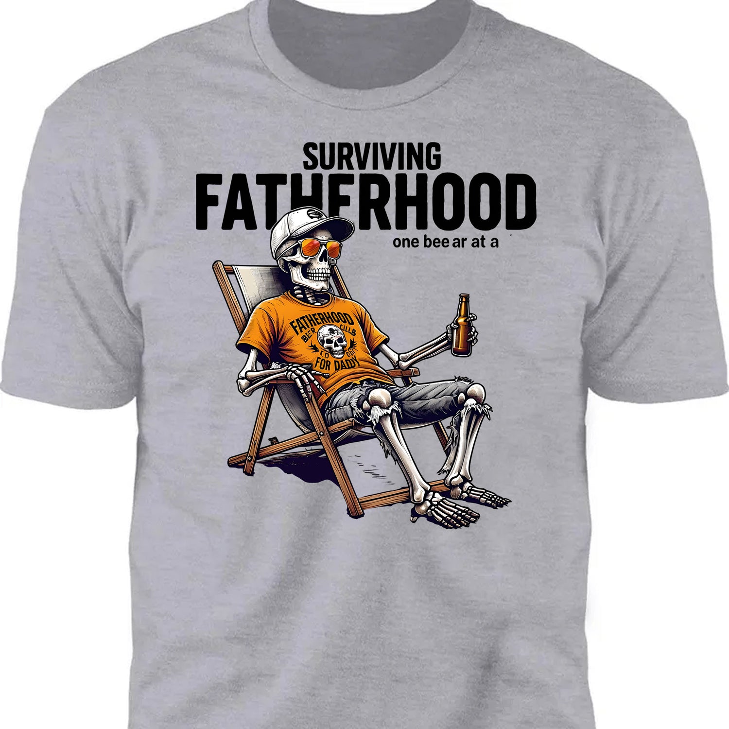 Raise a cold one to all the dads out there just trying to survive fatherhood—one beer at a time! This hilarious tee features a laid-back skeleton dad kicking back with a drink in hand, wearing shades and an “Official Fatherhood Survival Gear” shirt. It's the perfect gift for dads who’ve seen it all and lived to laugh about it. Great for Father’s Day, birthdays, or just because Dad deserves a cold beer and a break.
