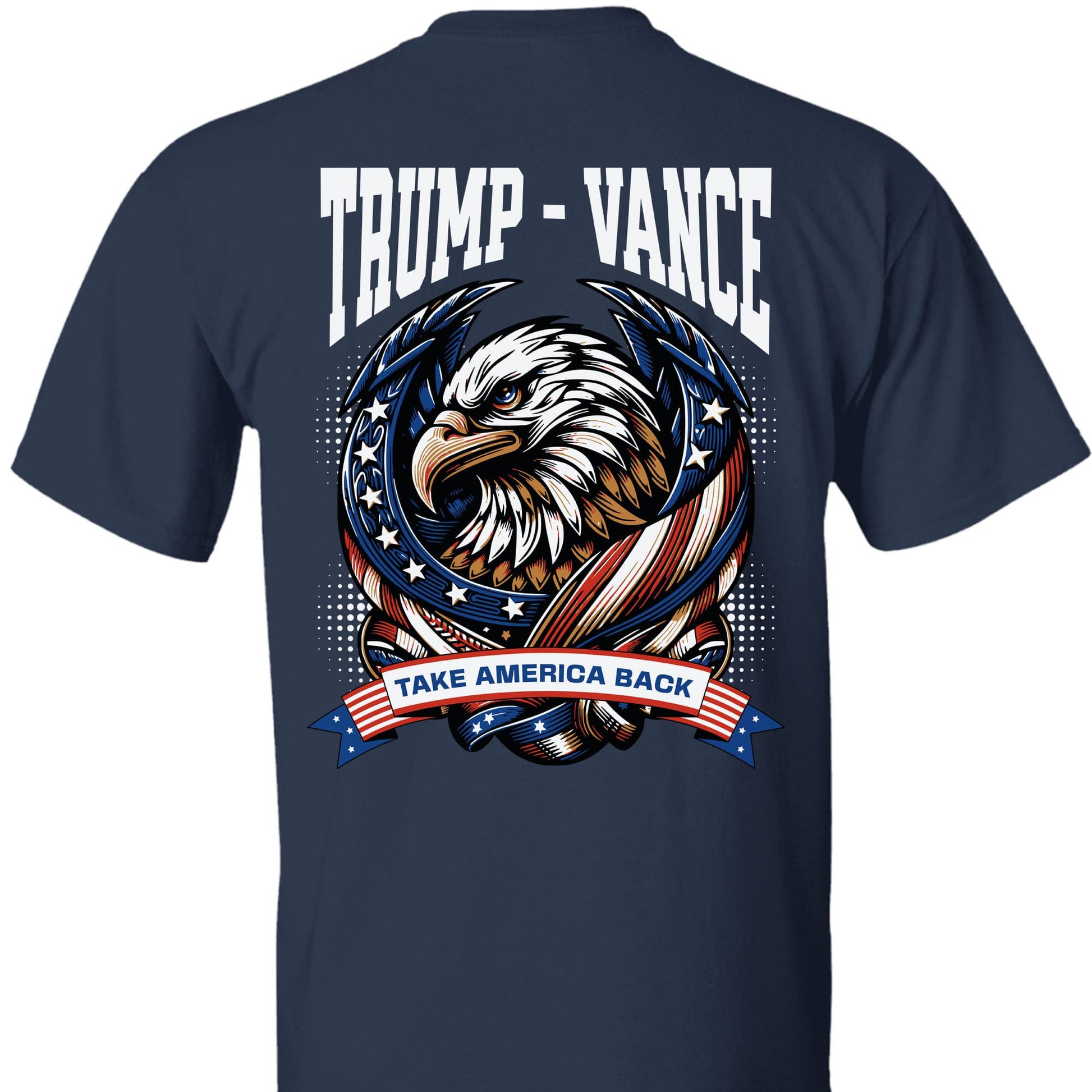 This shirt vividly displays a strong sense of patriotism and support for the political figures Donald Trump. On the back, it prominently features the names "TRUMP - VANCE" in large, bold letters. Below the names, an intricately designed bald eagle, a powerful symbol of American freedom and resilience, is depicted with an intense gaze.