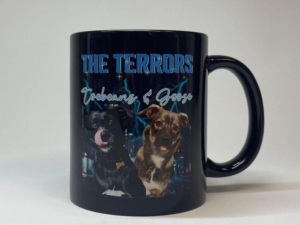 The design is printed on both sides of the mug.
