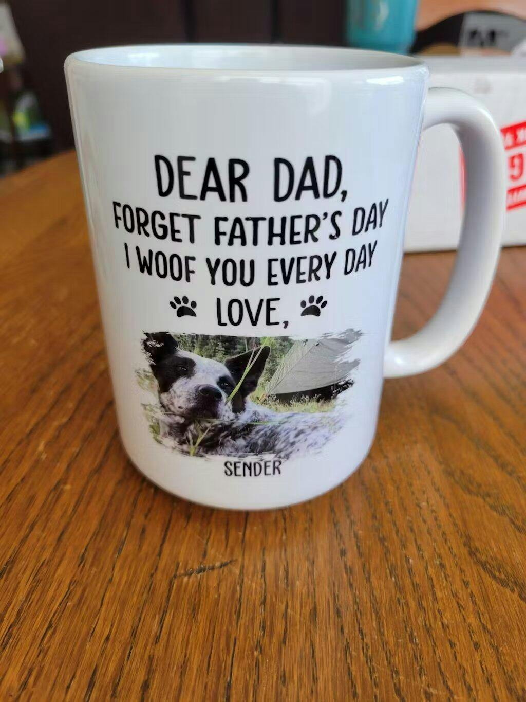 I love the mug I ordered for my son's father's day gift. His dog is his baby and I know he will get a kick out of her picture on a mug he can use!!