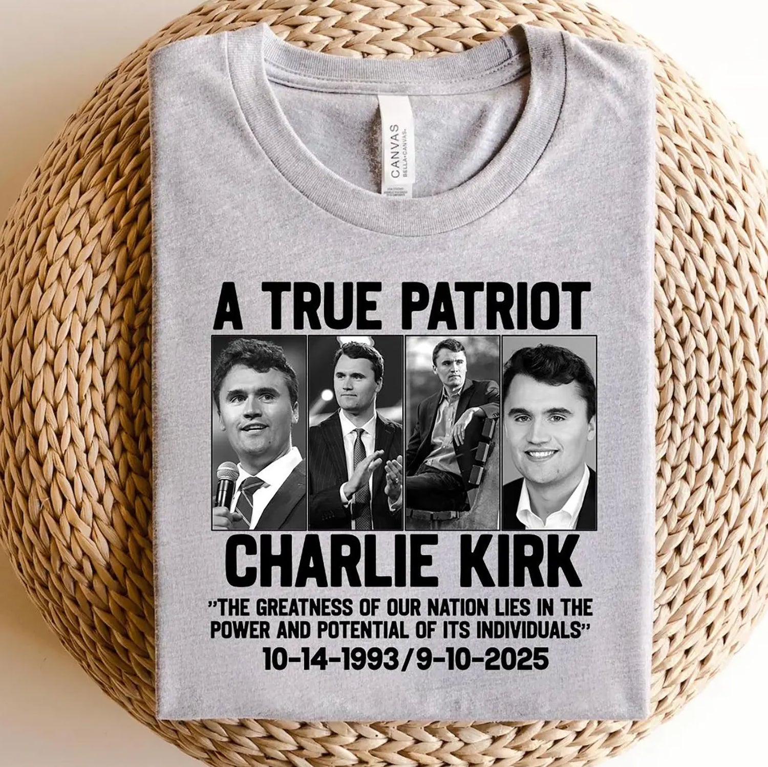 Honor the memory of Charlie Kirk with this tribute shirt. Featuring four portraits of him and the words “A True Patriot” above his name, the design includes one of his quotes: