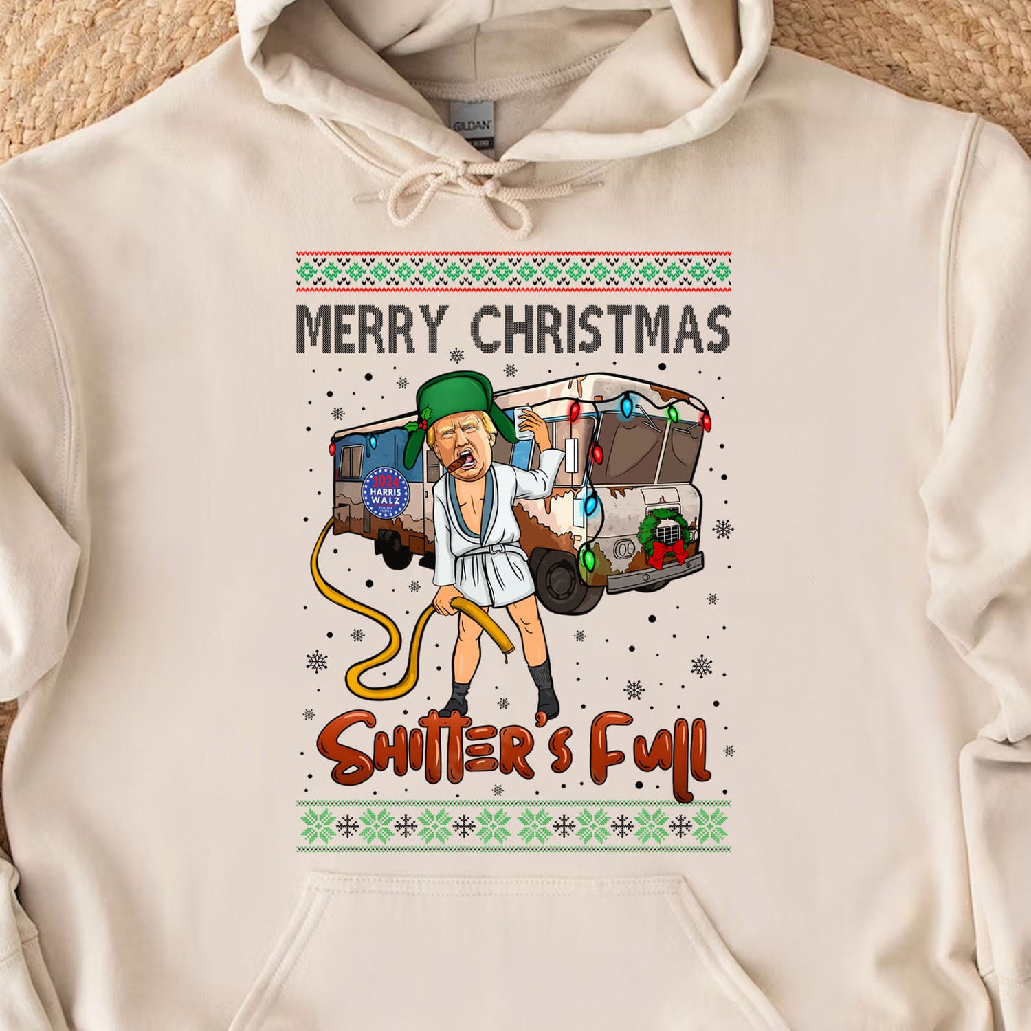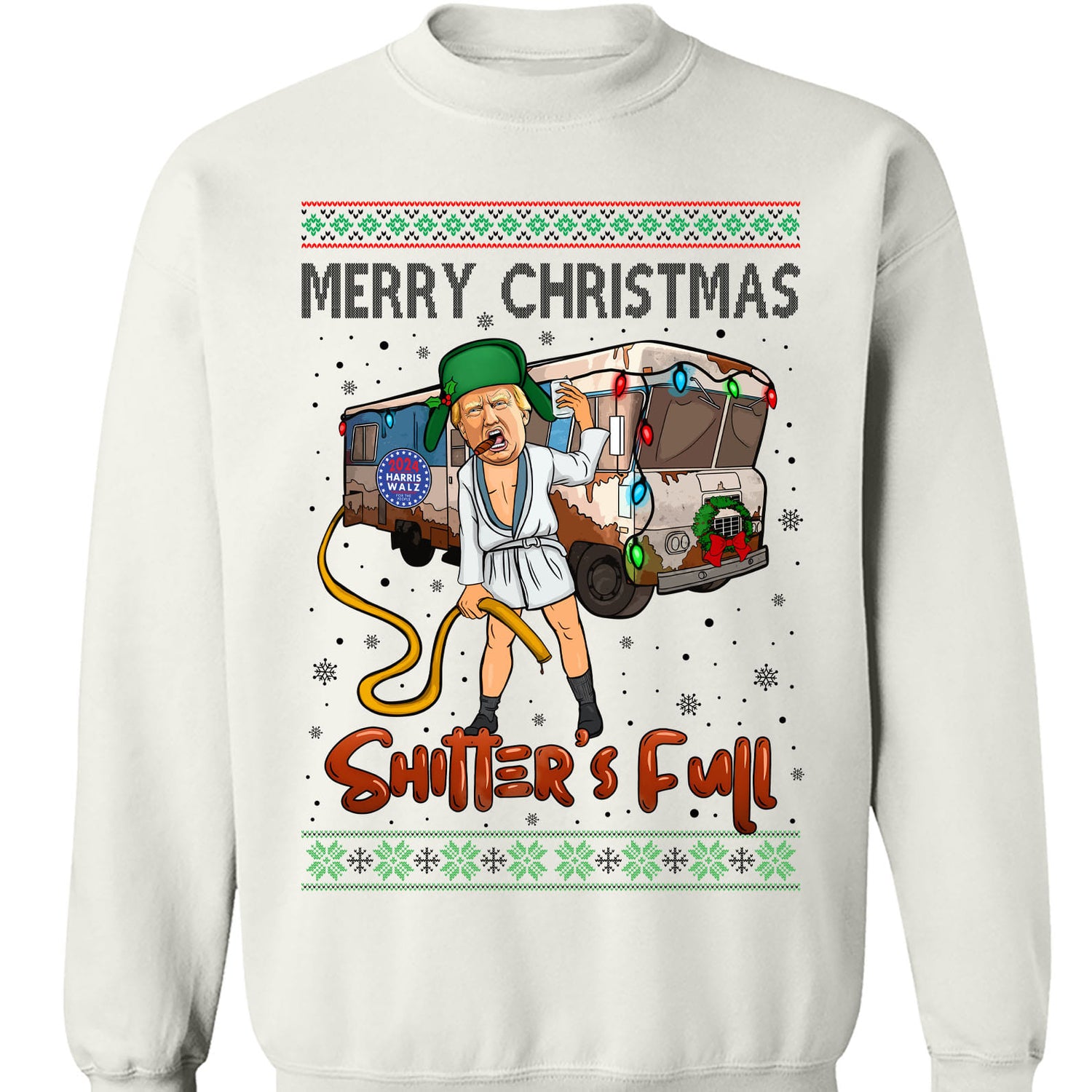 This Christmas-themed sweatshirt features a humorous design inspired by the iconic "National Lampoon's Christmas Vacation" movie scene, with a twist. The central character resembles Donald Trump, dressed in a white robe, green hat, and boots, holding a yellow hose with a comical expression. Behind him is a festive RV decorated with Christmas lights, snowflakes, and other holiday details, as well as a “Harris-Walz” 2024 bumper sticker. Above the character, the phrase "MERRY CHRISTMAS" is displayed in a knit-style font, while below it is the phrase "Shitter's Full" in bold red letters, creating a funny, irreverent holiday look. The design is framed with classic Christmas sweater patterns at the top and bottom, adding to the festive, retro aesthetic.