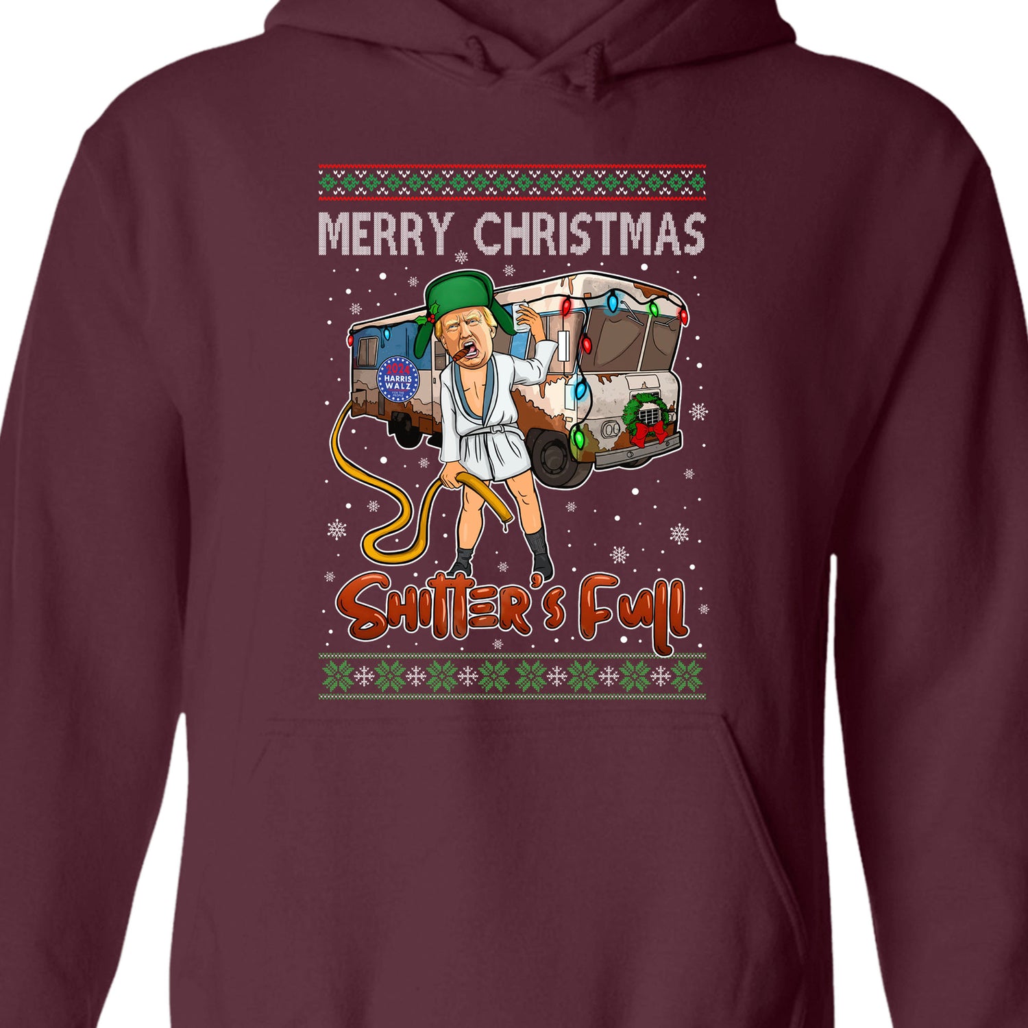 This Christmas-themed sweatshirt features a humorous design inspired by the iconic "National Lampoon's Christmas Vacation" movie scene, with a twist. The central character resembles Donald Trump, dressed in a white robe, green hat, and boots, holding a yellow hose with a comical expression. Behind him is a festive RV decorated with Christmas lights, snowflakes, and other holiday details, as well as a “Harris-Walz” 2024 bumper sticker. Above the character, the phrase "MERRY CHRISTMAS" is displayed in a knit-style font, while below it is the phrase "Shitter's Full" in bold red letters, creating a funny, irreverent holiday look. The design is framed with classic Christmas sweater patterns at the top and bottom, adding to the festive, retro aesthetic.