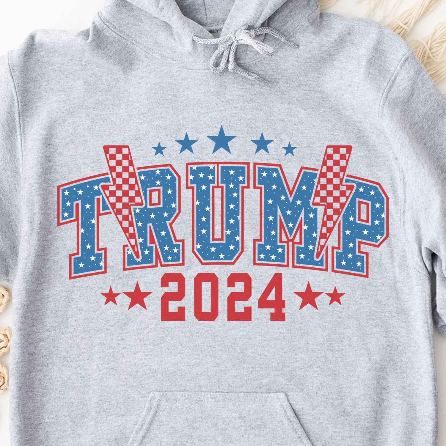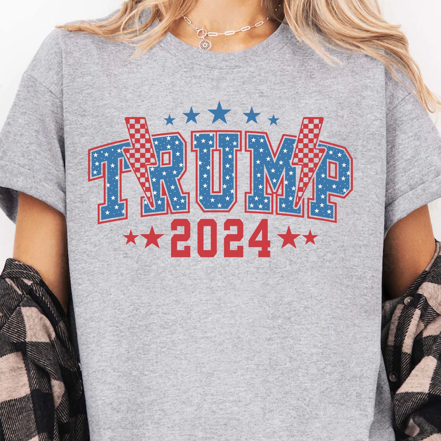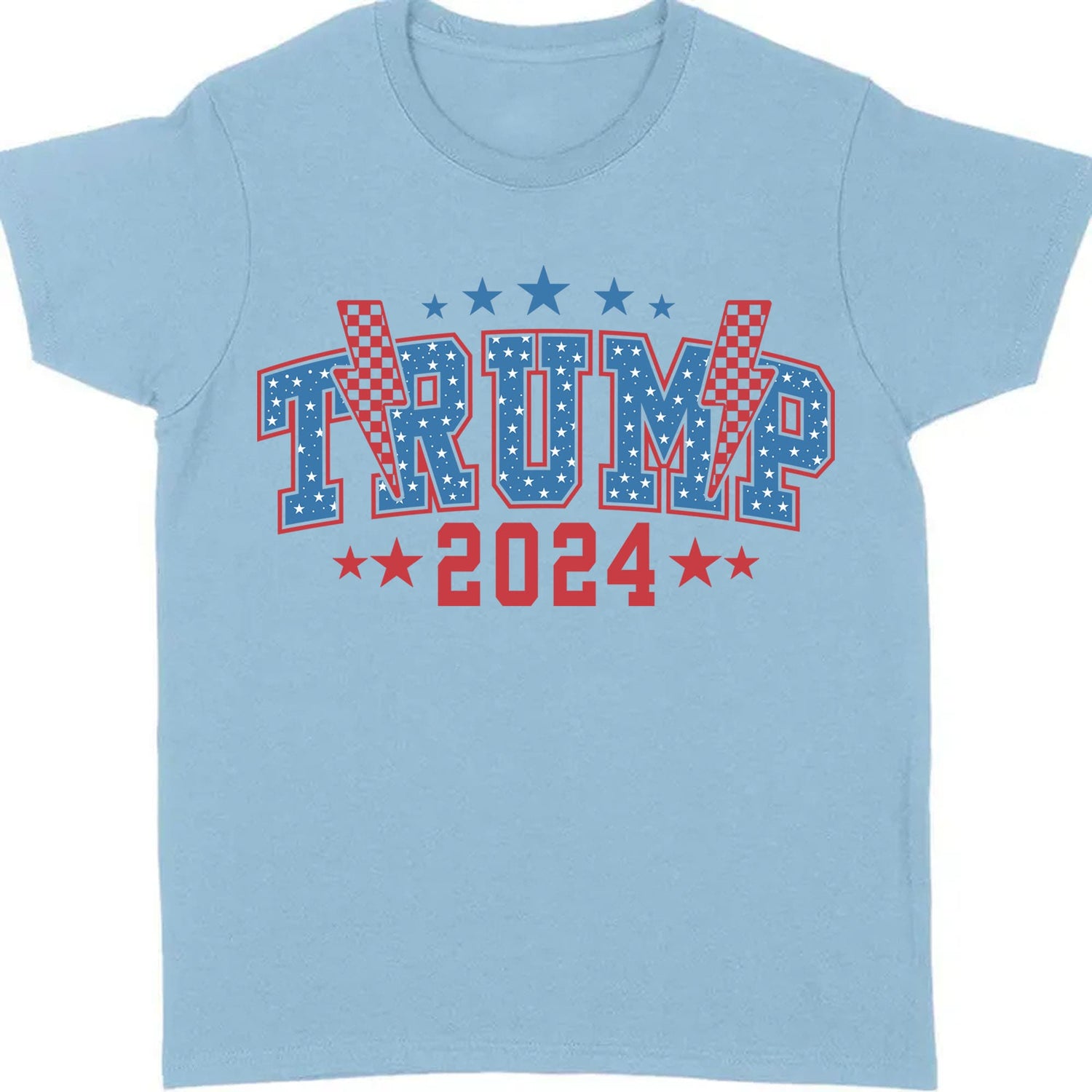 Show your unwavering support for Donald Trump in the upcoming 2024 election with this bold and electrifying shirt. Featuring the iconic "Trump 2024" text prominently displayed, this shirt is designed for passionate supporters who want to make a statement. The dynamic thunderbolt graphic behind the text adds a powerful and striking visual, symbolizing the energy and impact of Trump's campaign. Made from high-quality, comfortable fabric, it's ideal for everyday wear.