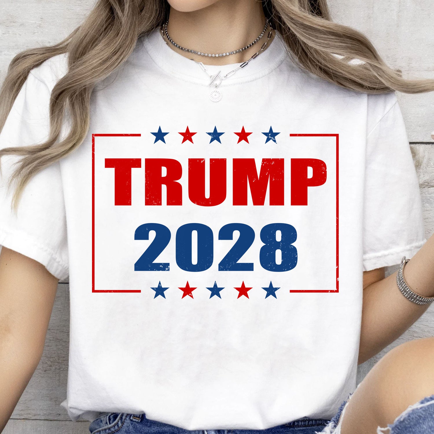 Show your support loud and proud with this bold Trump 2028 t-shirt! Featuring a striking red, white, and blue design with distressed star accents, this shirt is perfect for rallies, political events, or everyday wear for true supporters. Whether you’re looking ahead to the next campaign or making a statement, this tee is a must-have for your patriotic wardrobe.