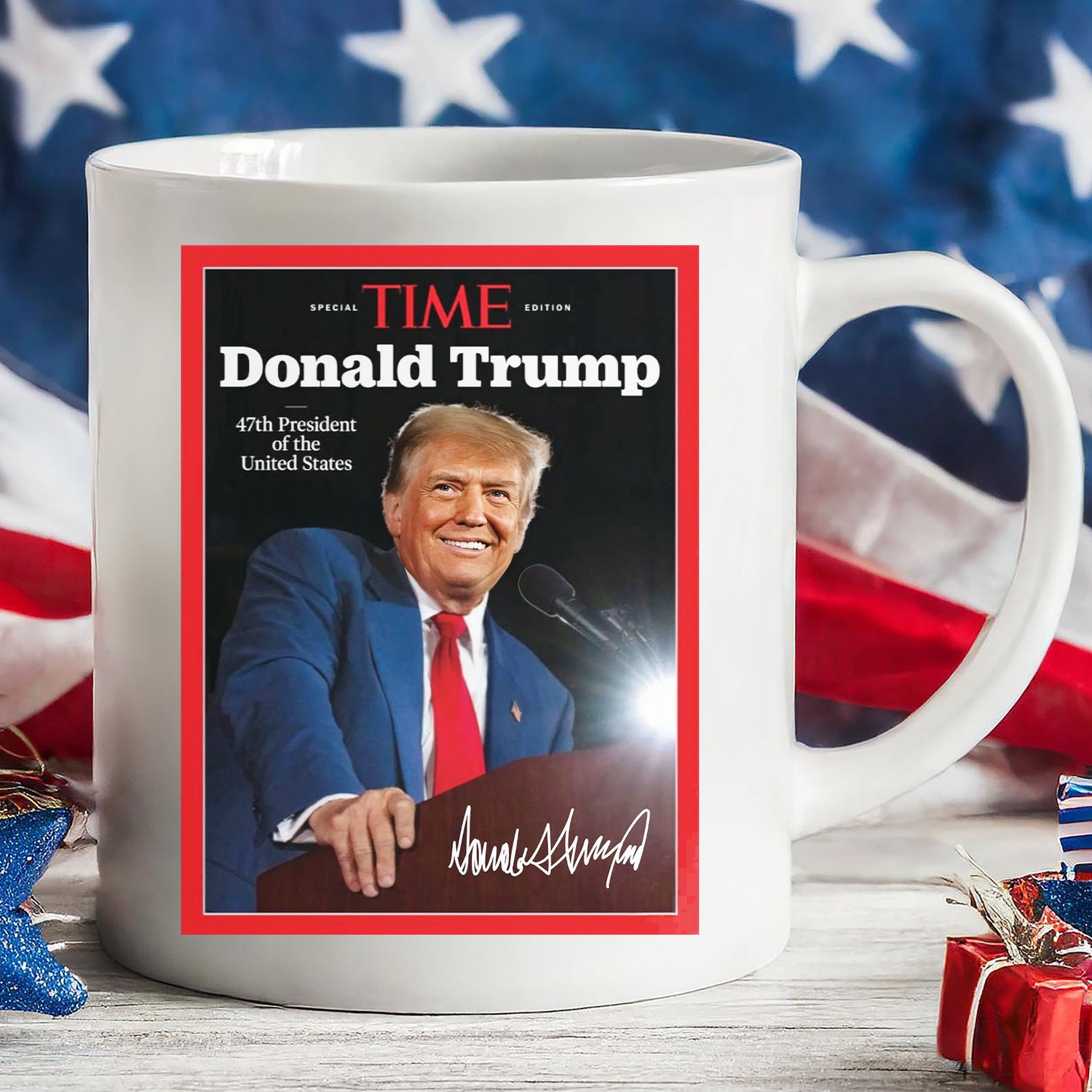 This ceramic mug features a bold and striking design inspired by a TIME magazine cover, showcasing a prominent figure with the title "Donald Trump - 47th President of the United States." The image captures a moment of leadership, paired with a vibrant red border and authentic signature detail, making it a standout addition to any collection. The mug is made from durable ceramic with a contrasting black handle and interior, ensuring both style and practicality. Celebrate history in style! Add this iconic mug to your collection or gift it to a fellow supporter today.