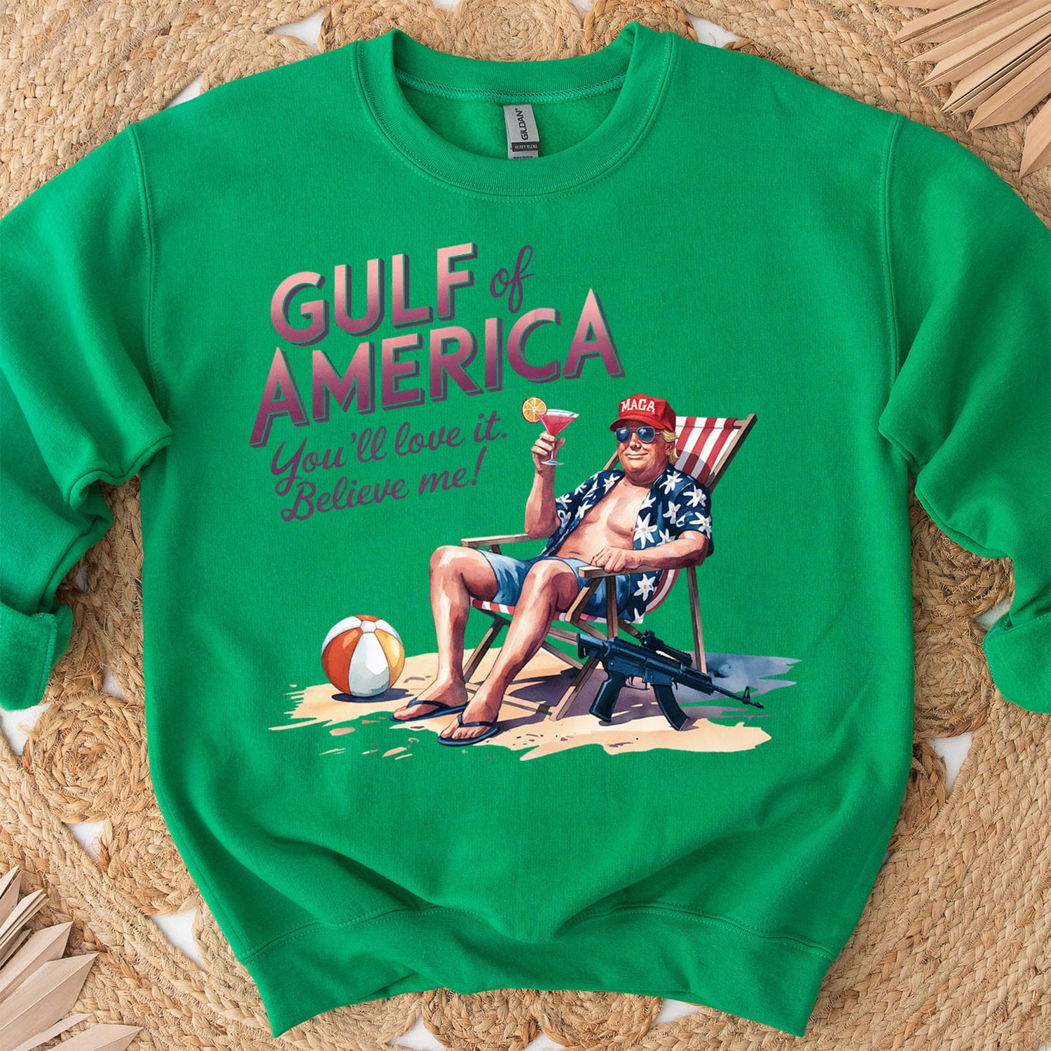 This playful and satirical sweatshirt features a beach scene with a caricature of a man resembling Donald Trump lounging in a beach chair. He’s wearing a red "MAGA" hat, sunglasses, a Hawaiian shirt, and flip-flops while holding a cocktail with a lemon slice. An assault rifle rests beside him on the sand, with a beach ball nearby. Above the image, the bold text reads "GULF of AMERICA" in a retro gradient font, followed by the phrase "You'll love it. Believe me!" in a playful cursive style. The bright-colored sweatshirt adds to the vintage, humorous vacation aesthetic.