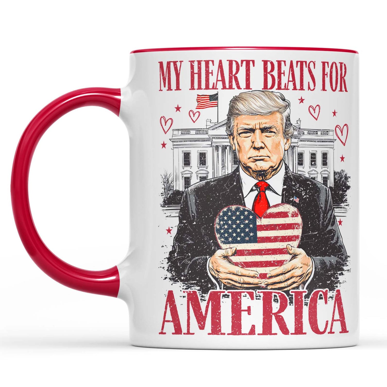 This mug features a patriotic and heartfelt design, showcasing the phrase "MY HEART BEATS FOR AMERICA" in bold red text. The centerpiece is an illustration of a leader holding a heart-shaped American flag, set against a backdrop of the White House. Surrounded by delicate hearts and patriotic elements, this design symbolizes love, pride, and devotion to the United States. Perfect as a gift for someone who cherishes their country or a way to express your own patriotic spirit!