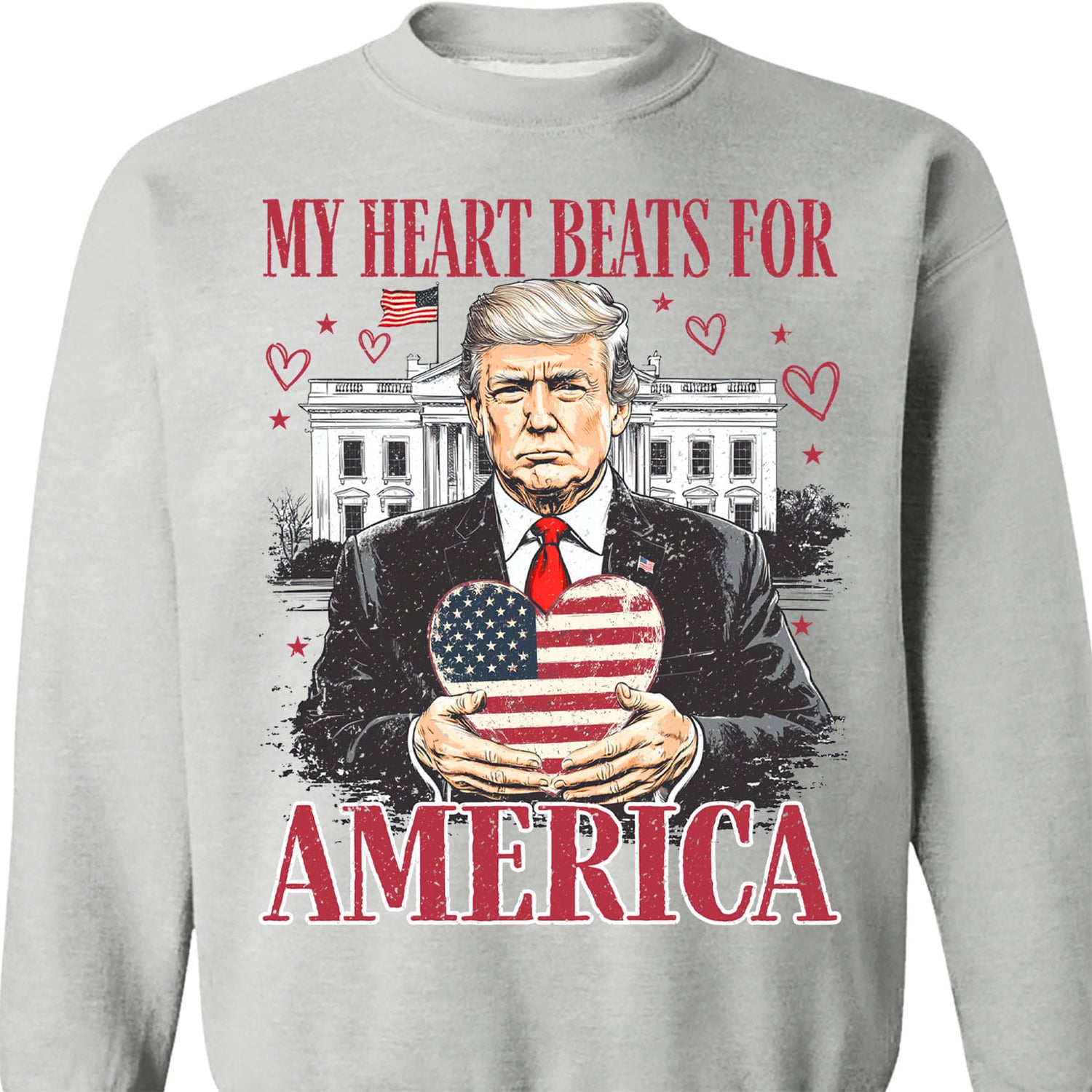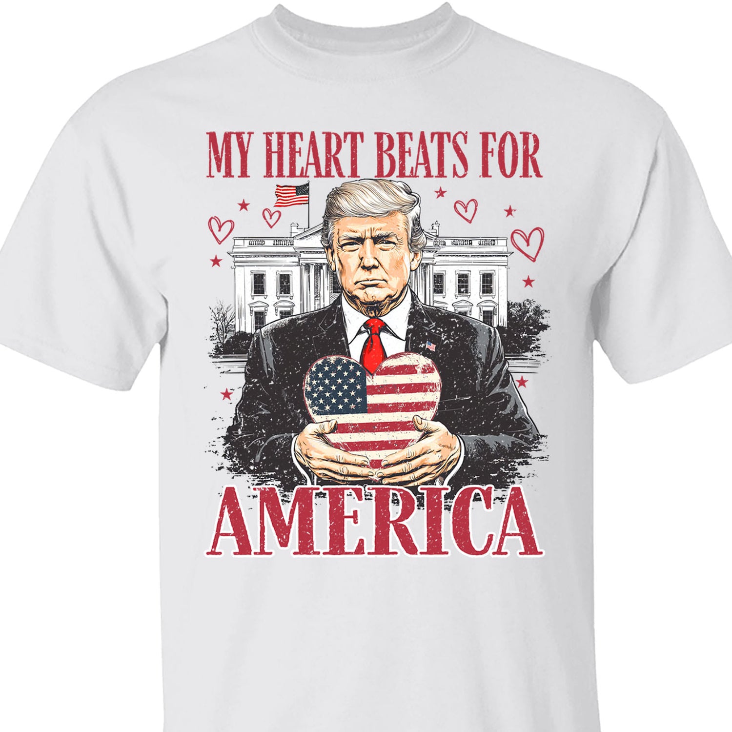 This patriotic shirt proudly showcases the bold phrase "MY HEART BEATS FOR AMERICA" paired with a striking illustration of a leader holding a heart-shaped American flag. Set against the iconic backdrop of the White House and surrounded by heart accents, this design symbolizes love, pride, and unwavering devotion to the United States. Made from high-quality fabric, this shirt is perfect for patriotic events, rallies, holidays, or everyday wear to show your love for America in style.