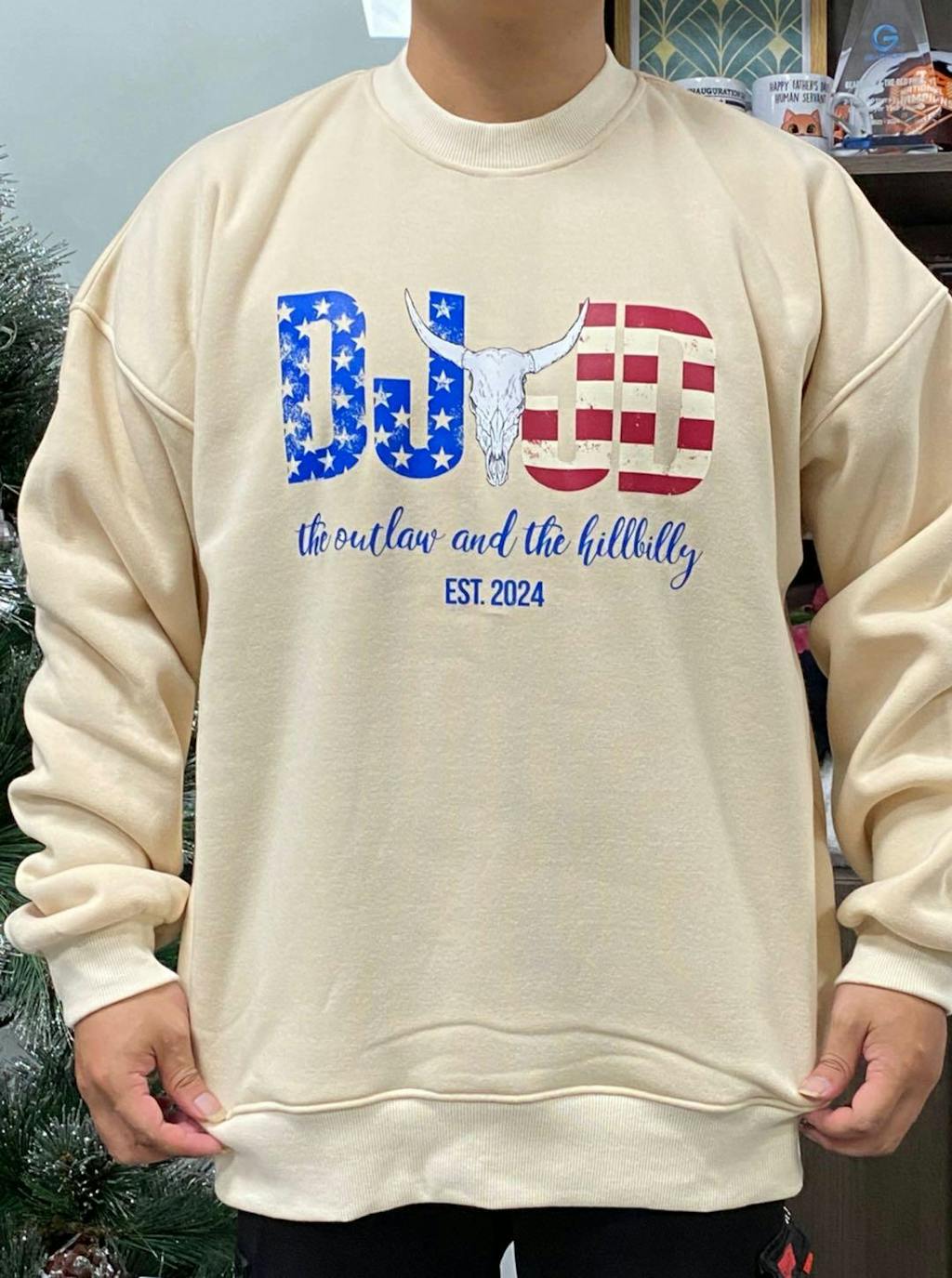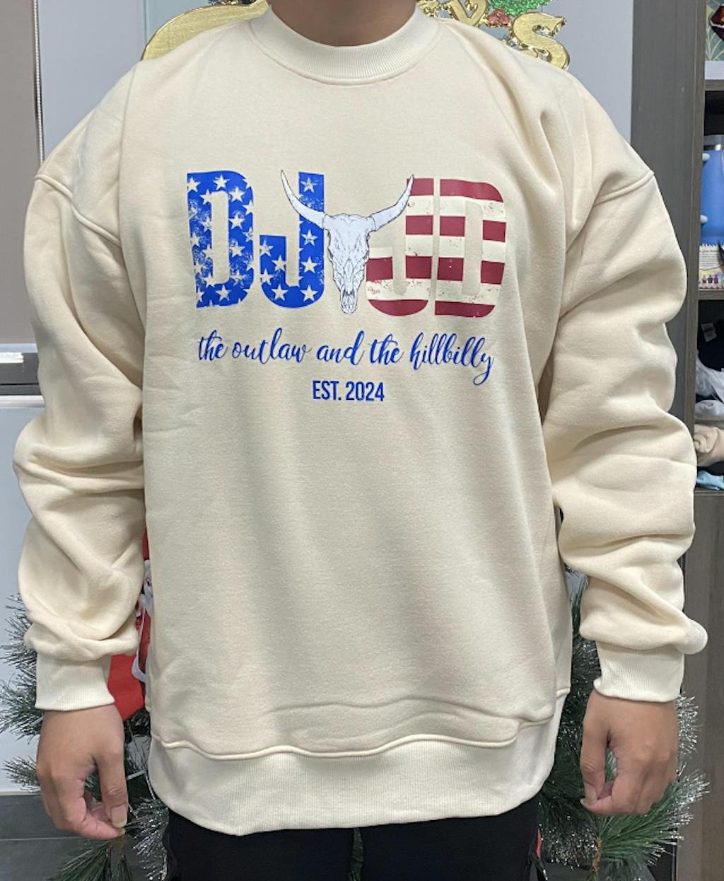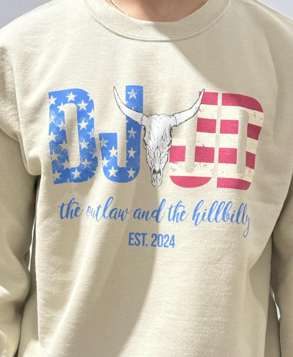 This sweatshirt design features bold, distressed letters "DJ" and "JD" with a patriotic twist. The "DJ" is filled with a blue background and white stars, while "JD" is adorned with red and white stripes, resembling the American flag. In the center of the design is a detailed skull of a longhorn, adding a rustic, Western vibe to the look. Below the letters, in an elegant script, is the phrase "the outlaw and the hillbilly," followed by "EST. 2024" in a bold font. The combination of the rugged elements with the patriotic color scheme makes this design both striking and full of character.