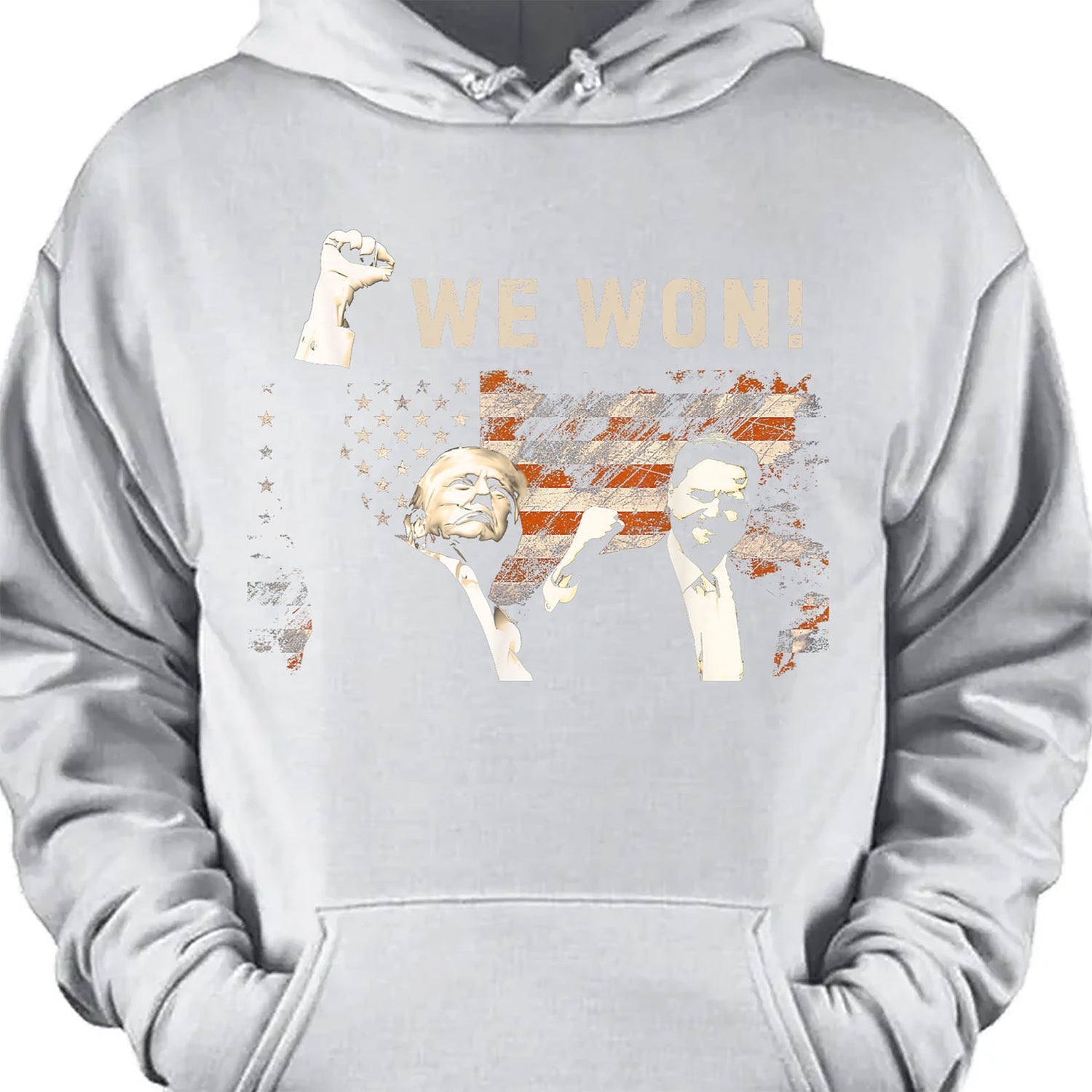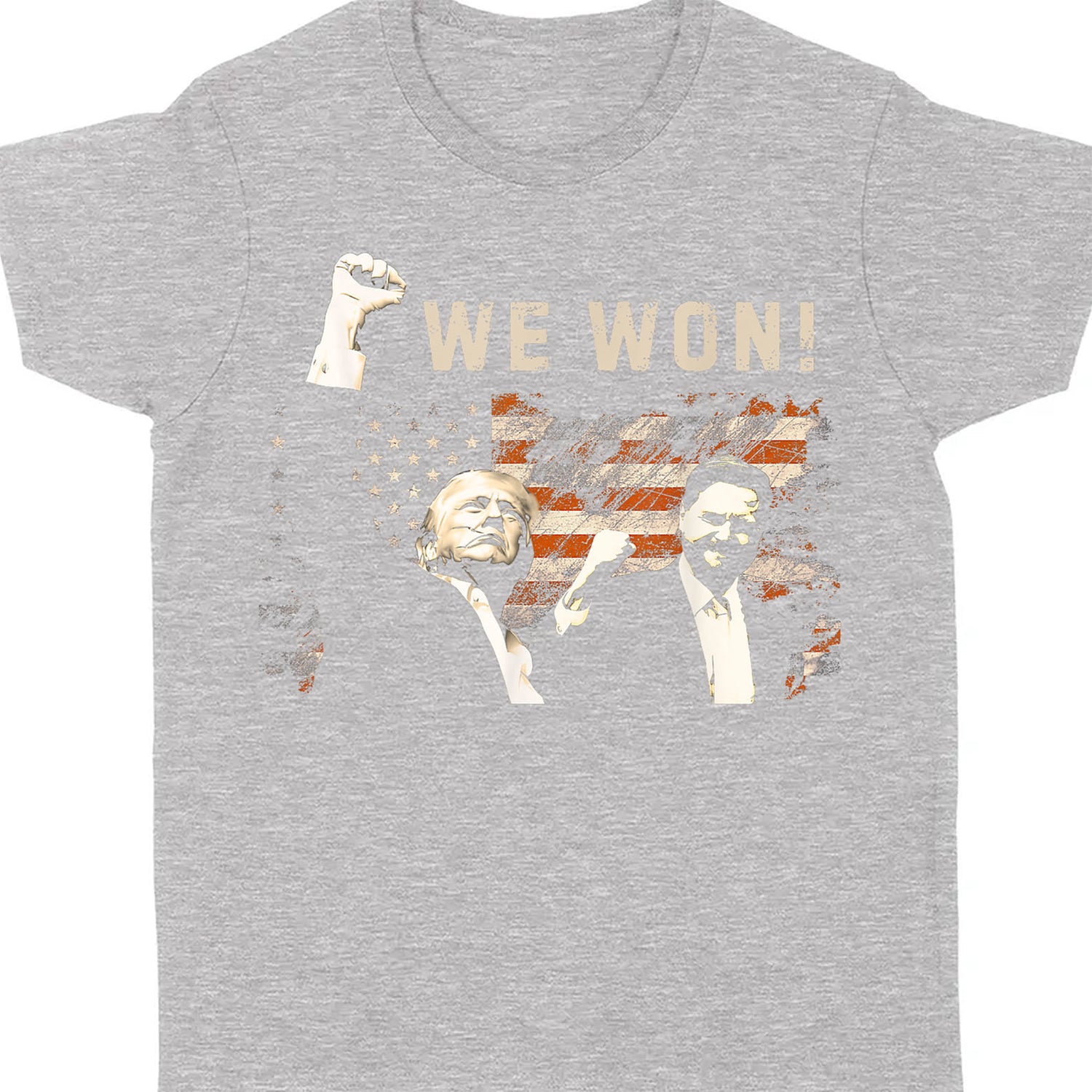 This patriotic t-shirt design features bold images of Donald Trump and J.D. Vance, both raising their fists triumphantly in the air. Behind them, the American flag is displayed in a grunge style, adding a rugged, vintage feel to the design. Above the images, the powerful phrase "WE WON" is printed in bold text, making a strong statement of victory and pride. This shirt is perfect for supporters looking to celebrate their political beliefs with confidence and style. Great for rallies, gatherings, or casual wear, it’s a standout way to show your American spirit and support.