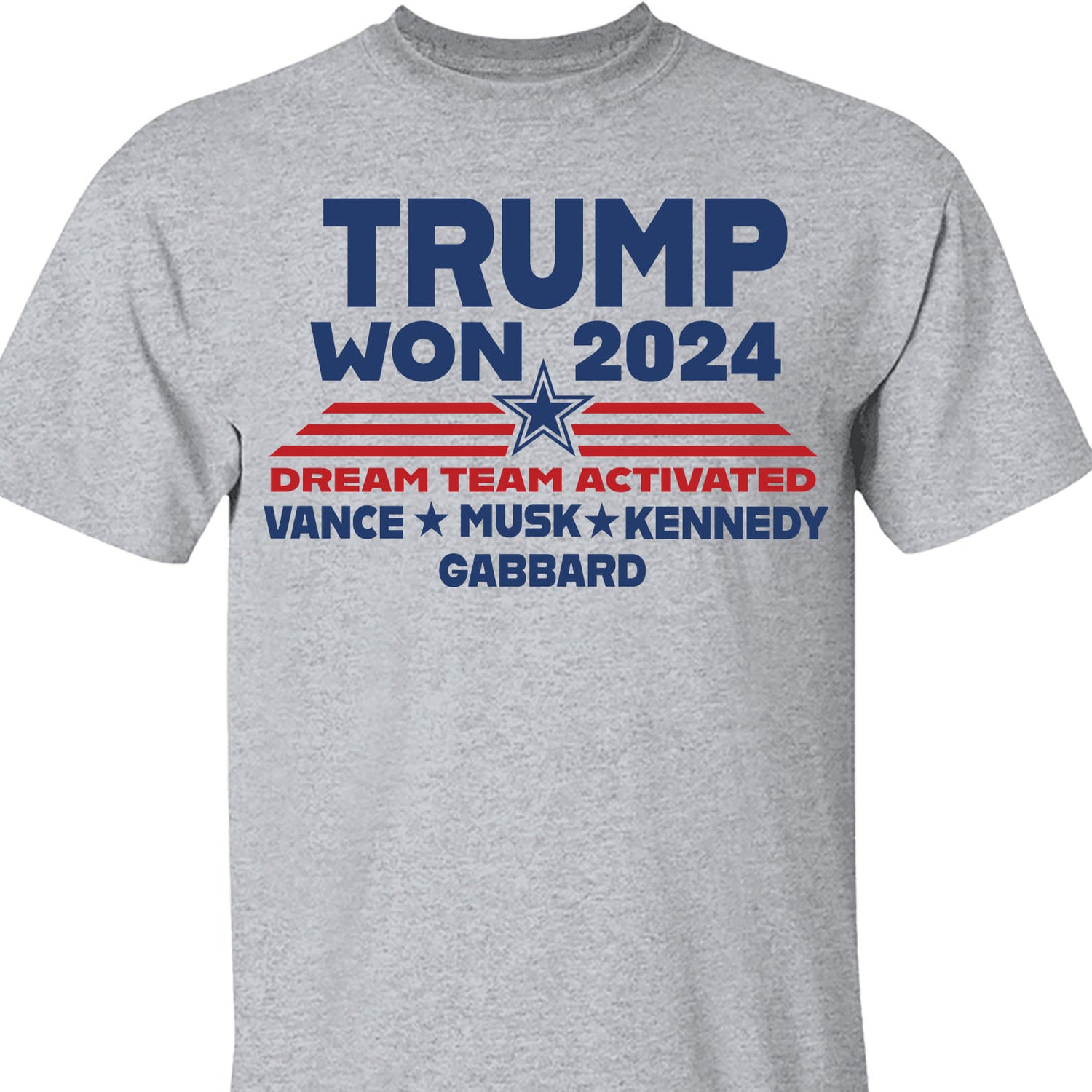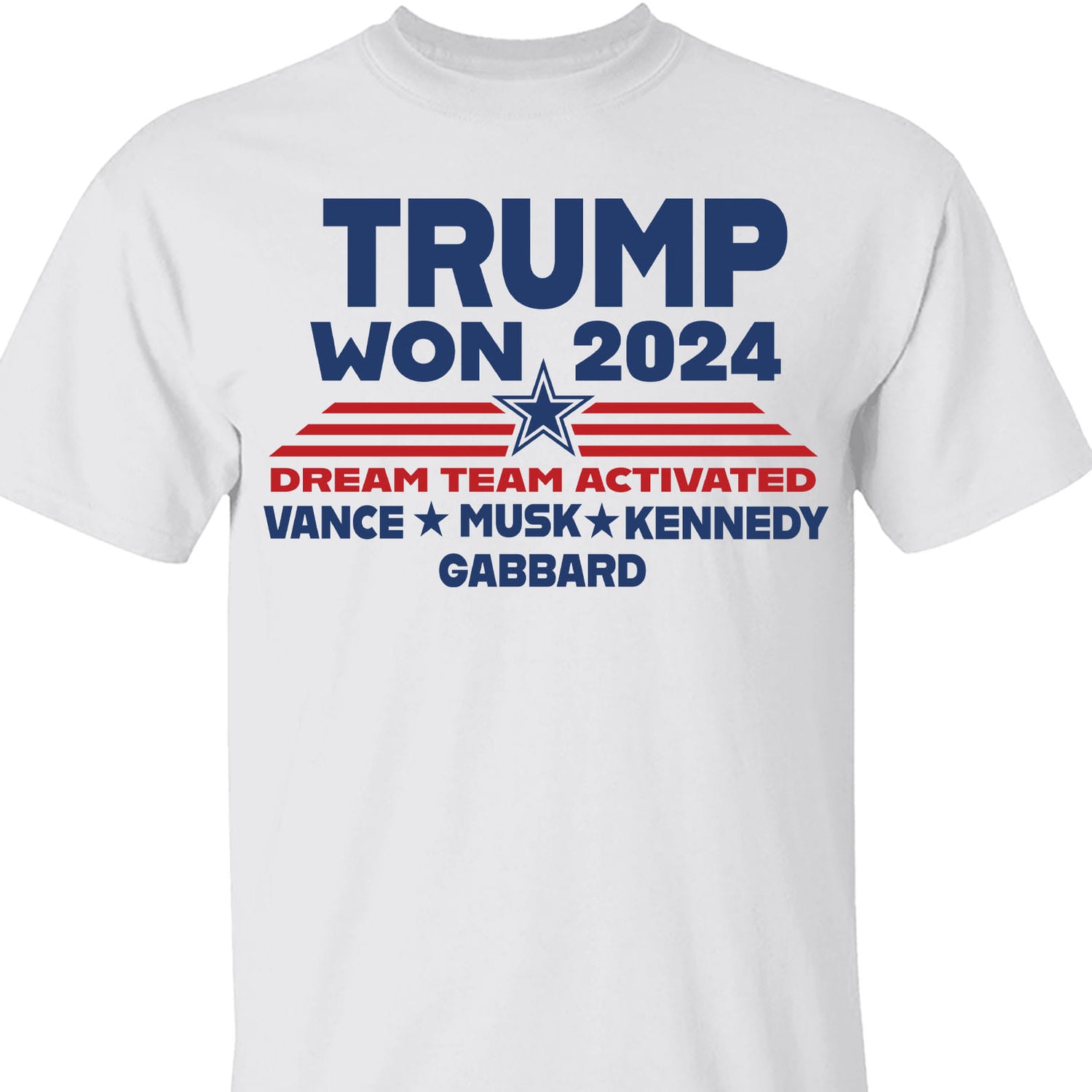 This shirt features a bold and patriotic design with the word "TRUMP" in a strong blue color at the top. Directly below, the text "WON 2024" appears in the same blue color, signifying a victorious message. Underneath is a large central star, flanked by three red lines on each side, adding a bold visual accent. Below this, the phrase "DREAM TEAM ACTIVATED" is displayed in vibrant red, highlighting a call to action. At the bottom, the names "Vance, Musk, Kennedy, Gabbard" are listed with blue stars separating each name, creating a unified, team-oriented look.