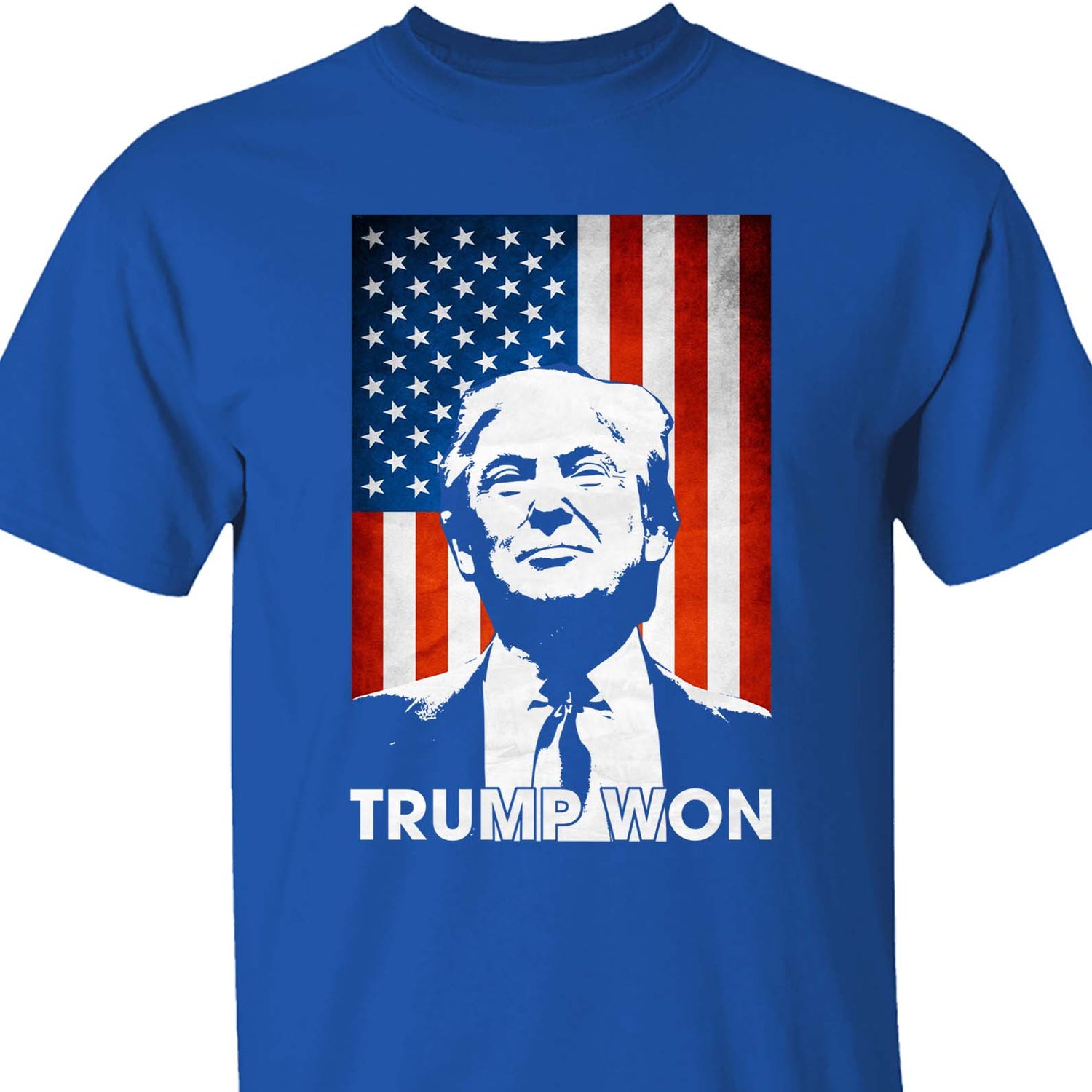 This bold t-shirt features a striking silhouette of Donald Trump set against the backdrop of the American flag, creating a powerful visual impact. Below the image, the phrase "Trump Won" appears in crisp white lettering, standing out against the shirt’s color. This design makes a statement and is ideal for supporters looking to express their views with a patriotic touch. Comfortable and stylish, it’s perfect for rallies, events, or casual wear.