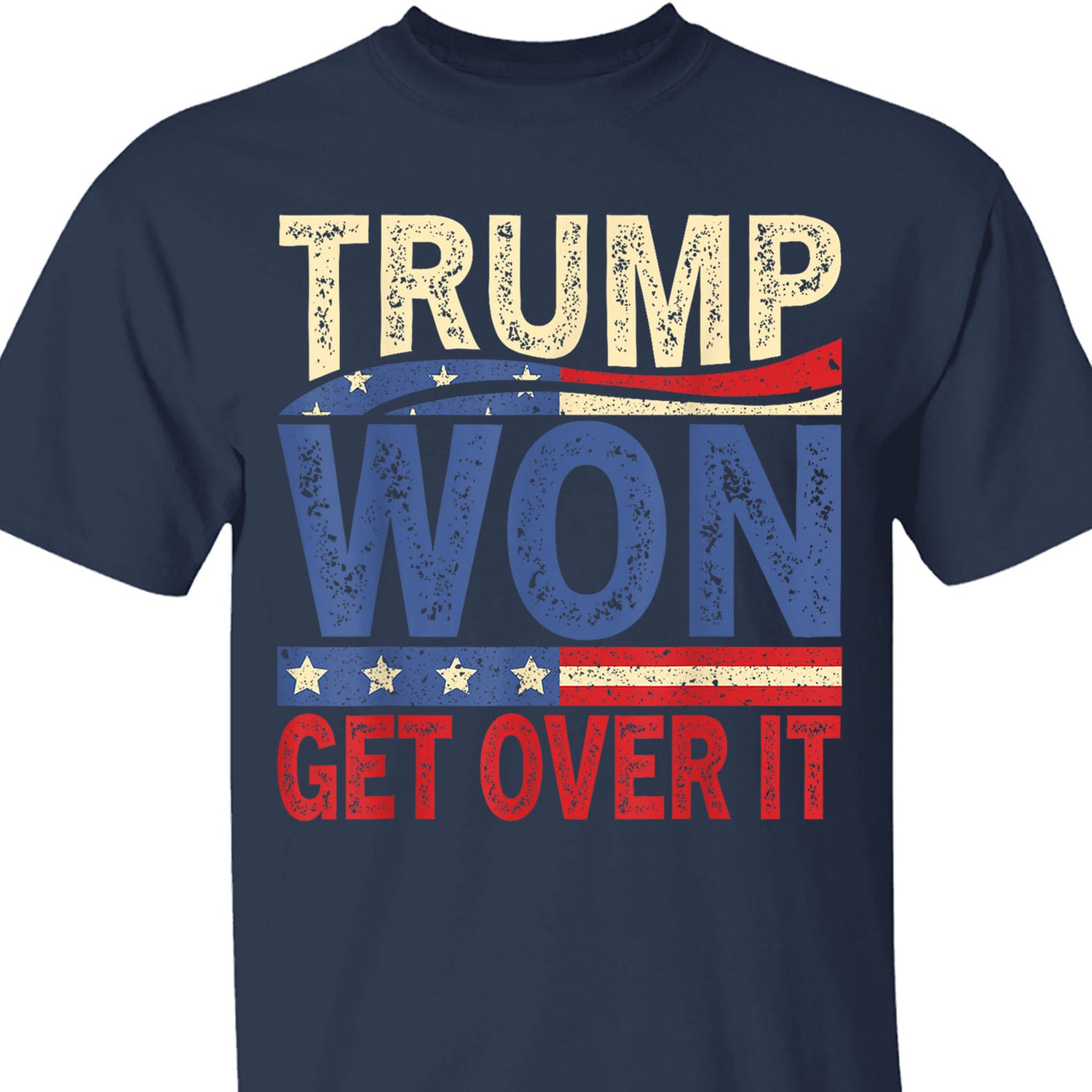 This t-shirt features a bold design with the words "TRUMP WON" in large, distressed letters. The word "TRUMP" is displayed in a light beige color, while "WON" is in a dark blue. A stylized American flag runs through the center of the design, with stars and stripes adding a patriotic touch. Below "WON," the phrase "GET OVER IT" appears in bold, red text with a weathered effect. The overall color scheme incorporates red, white, and blue, evoking the American flag, and the entire design has a vintage, worn look.