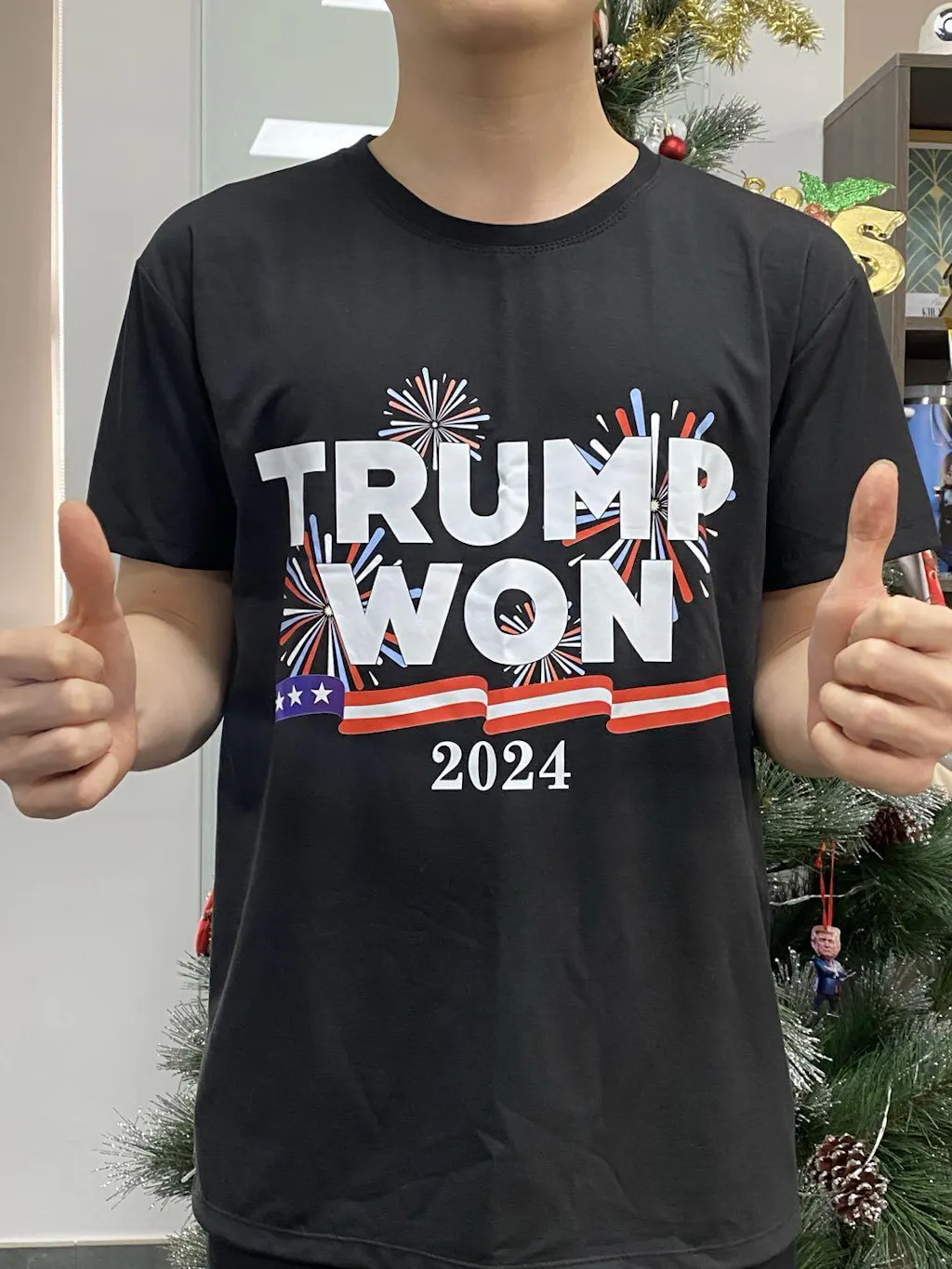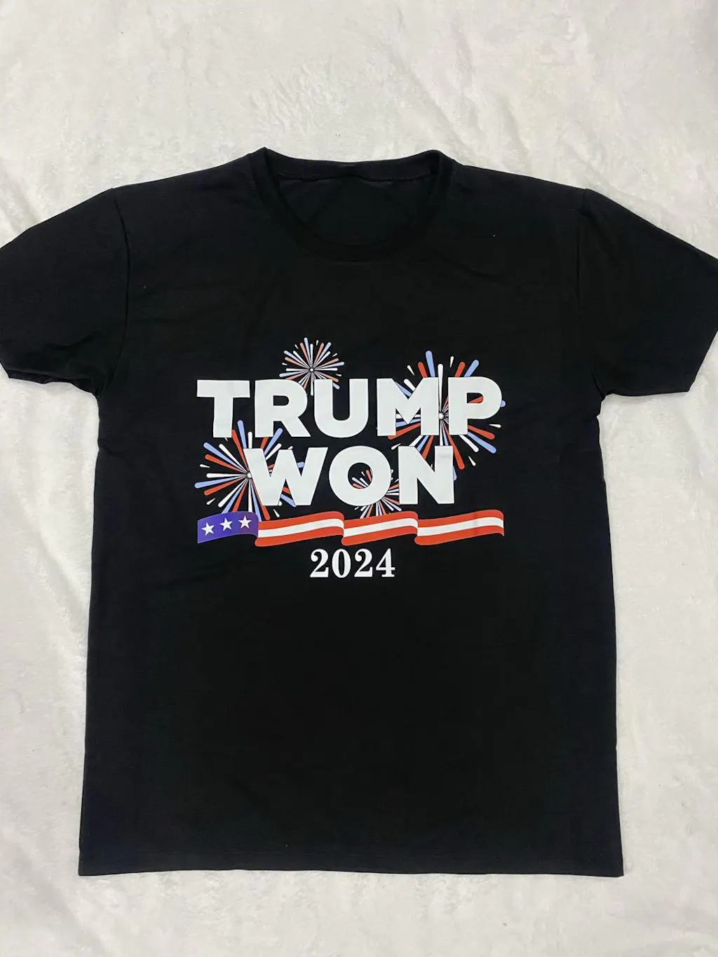 This shirt features the bold phrase "TRUMP WON" in striking white text at the center, backed by a colorful display of fireworks to create a celebratory and patriotic feel. Below the text is a ribbon strip inspired by the American flag, adding a sense of national pride with its red, white, and blue colors. Underneath the ribbon, the year "2024" is displayed in matching white, tying the design together. The combination of bold text, fireworks, and patriotic elements makes this shirt a strong statement piece.