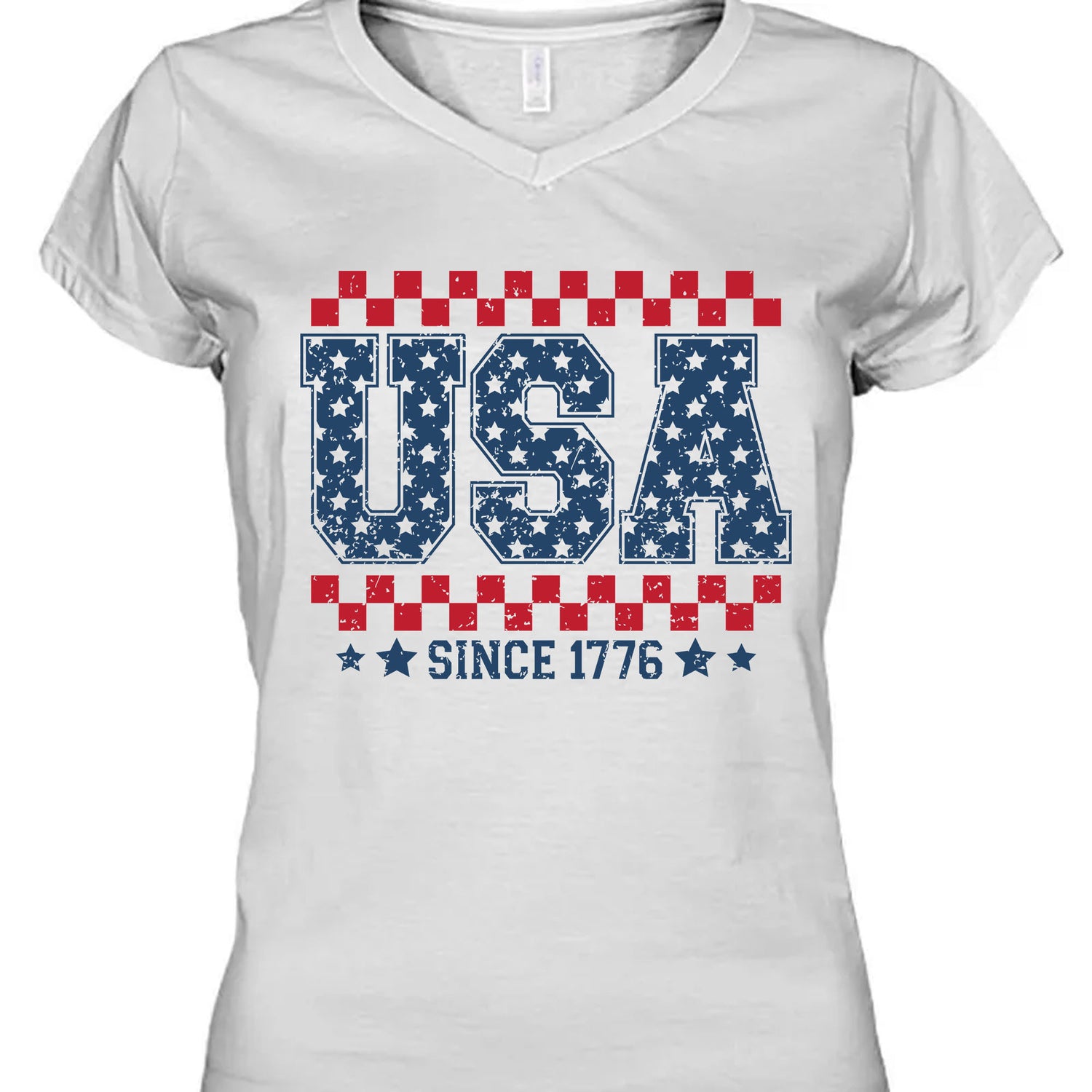 Show off your love for freedom, liberty, and the red, white, and blue with this bold USA Since 1776 T-shirt. Featuring a vintage distressed look, this design includes star-filled block letters and patriotic checkerboard stripes — perfect for celebrating America’s birthday in style.