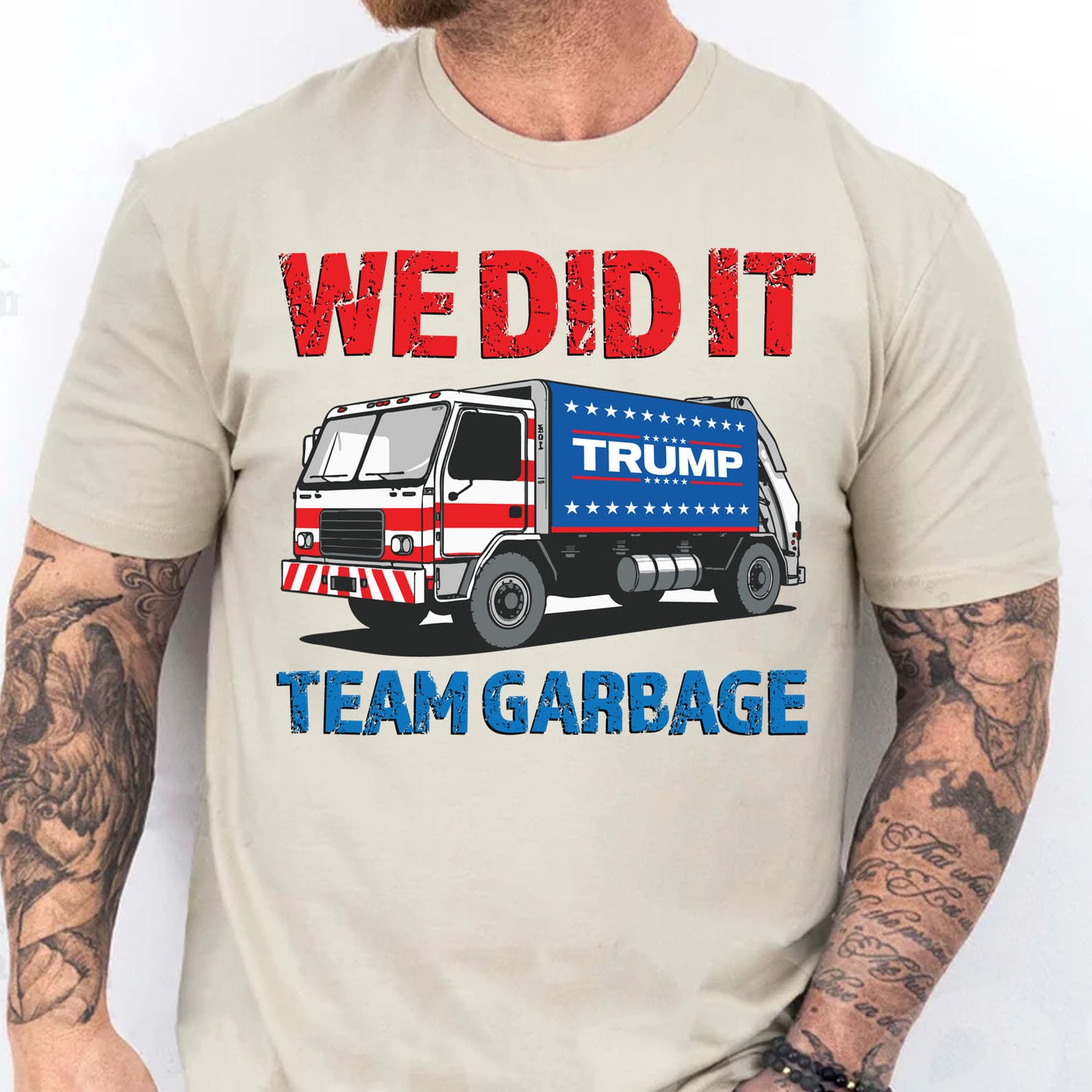 This shirt features a bold and gritty design with an illustrated garbage truck as the focal point. Above the truck, the phrase "WE DID IT" appears in bold red text with a grunge effect, giving it a rugged, impactful style. Below the truck, the words "TEAM GARBAGE" are displayed in matching bold, grunge text but in a blue color, balancing the design with a patriotic feel. The combination of the distressed font and vivid colors creates a striking, tough look that makes a statement with humor and attitude.