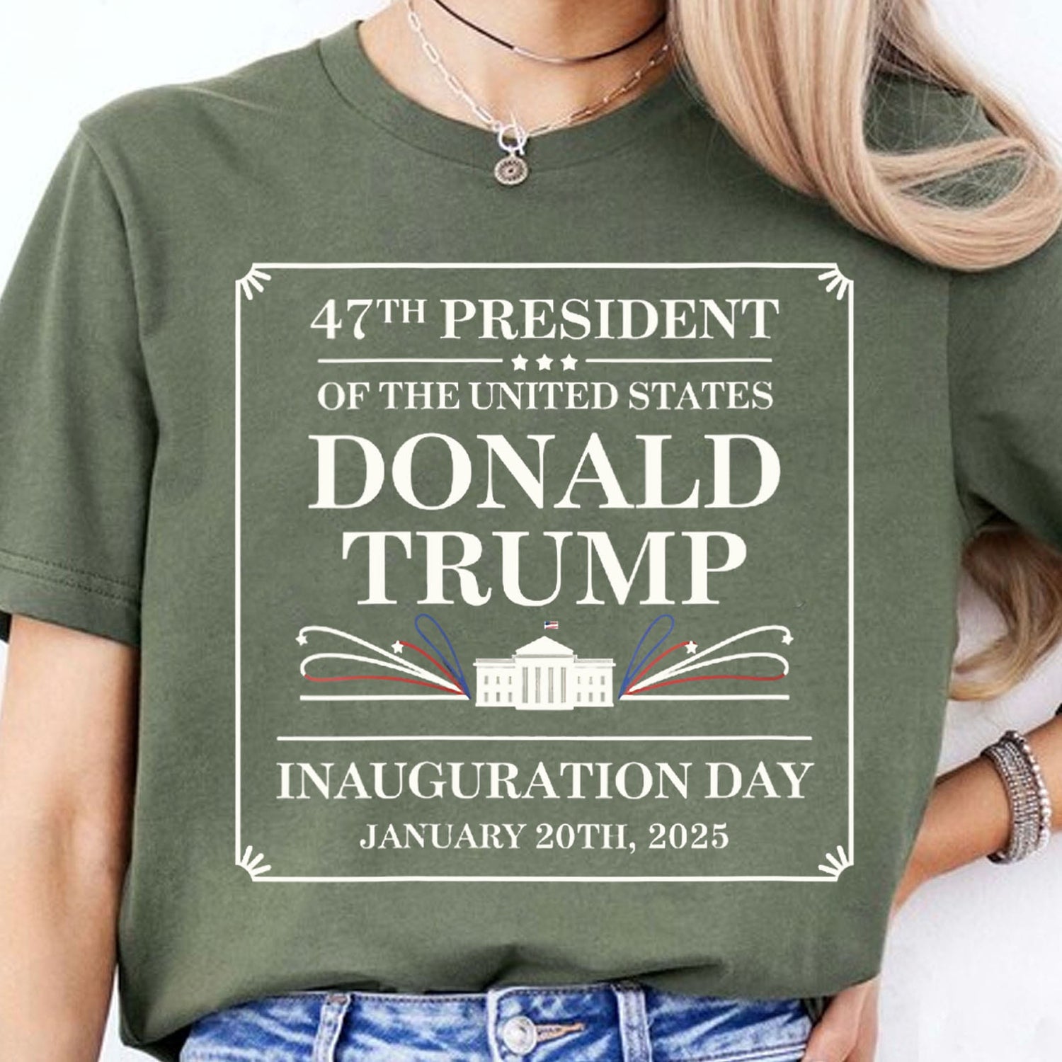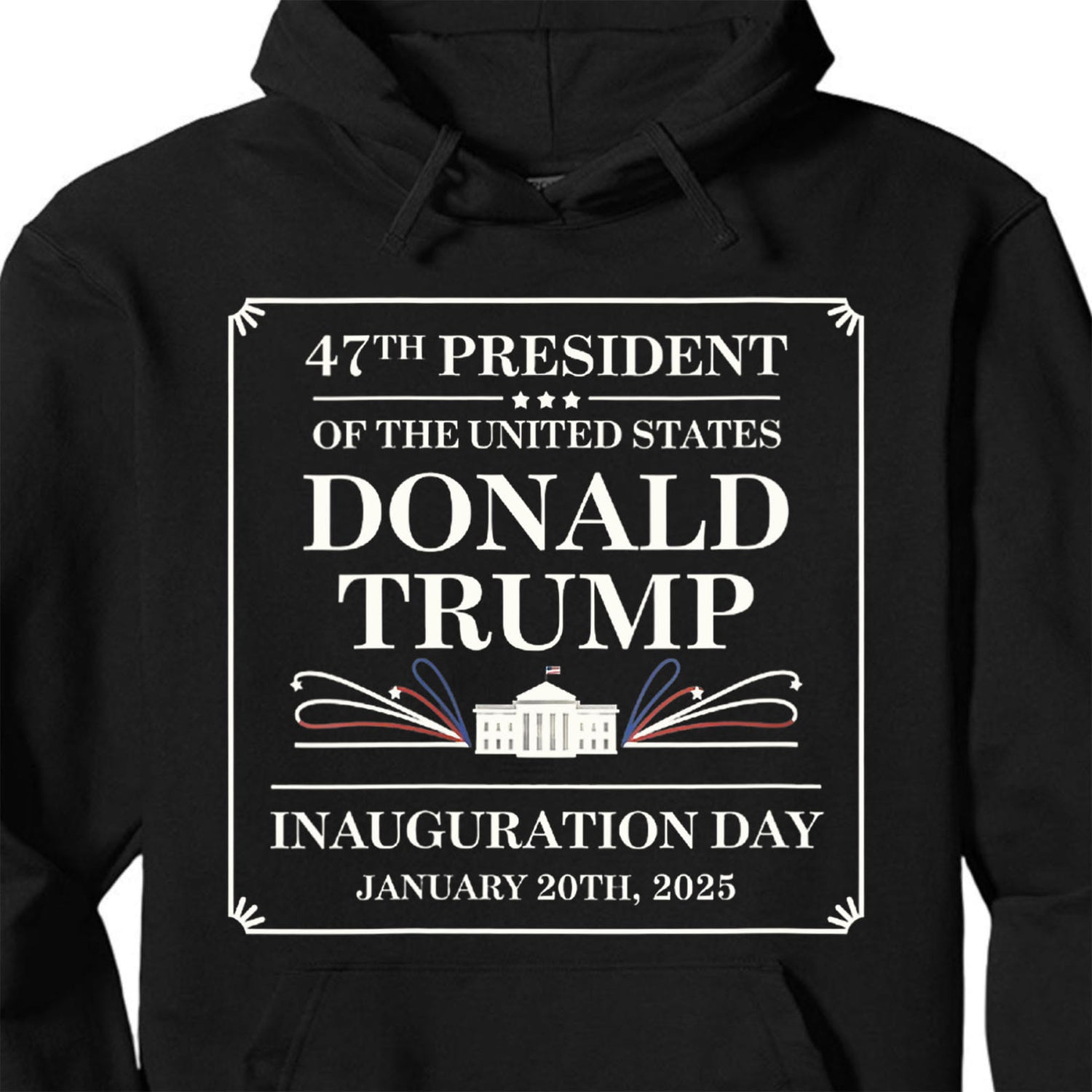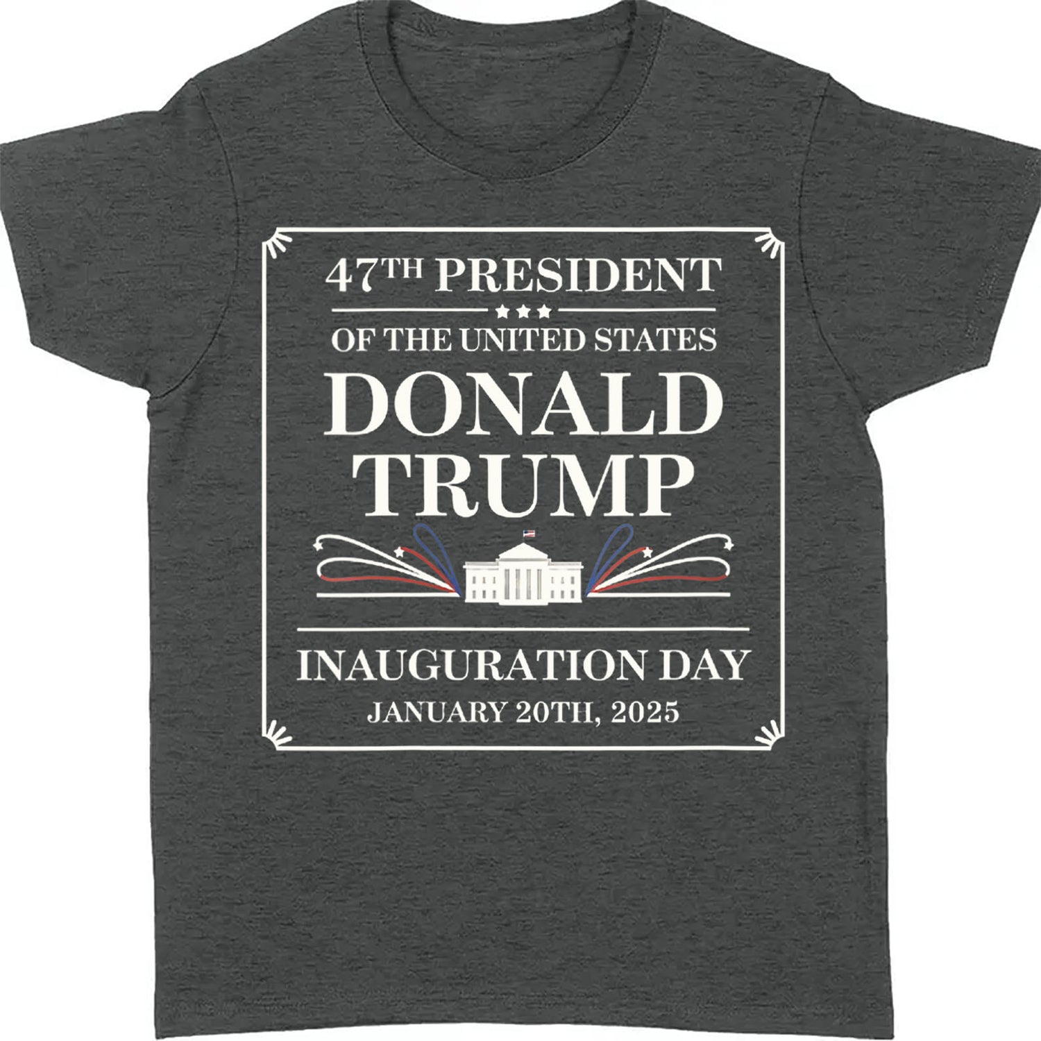 This shirt design commemorates Donald Trump as the "47th President of the United States." The text is centered within a bordered rectangular frame, with elegant corner details. At the top, "47TH PRESIDENT OF THE UNITED STATES" is displayed in a refined serif font, followed by "DONALD TRUMP" in large, bold letters. Below this is an illustration of the White House with red, white, and blue decorative flourishes extending outward, adding a patriotic touch. At the bottom, the text "INAUGURATION DAY" appears, along with the date "JANUARY 20TH, 2025." The design uses a classic white font on a black shirt, giving it a formal and celebratory look.