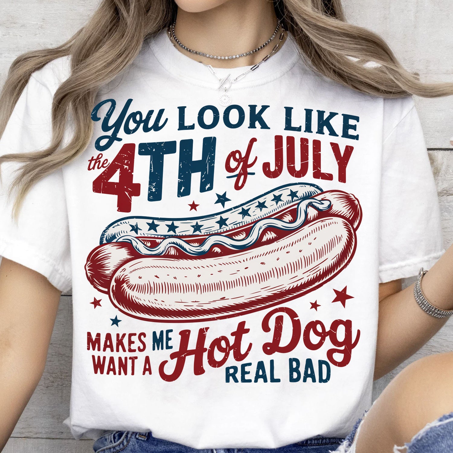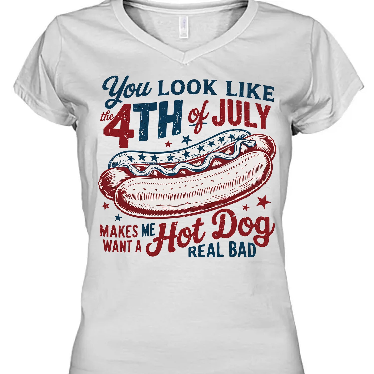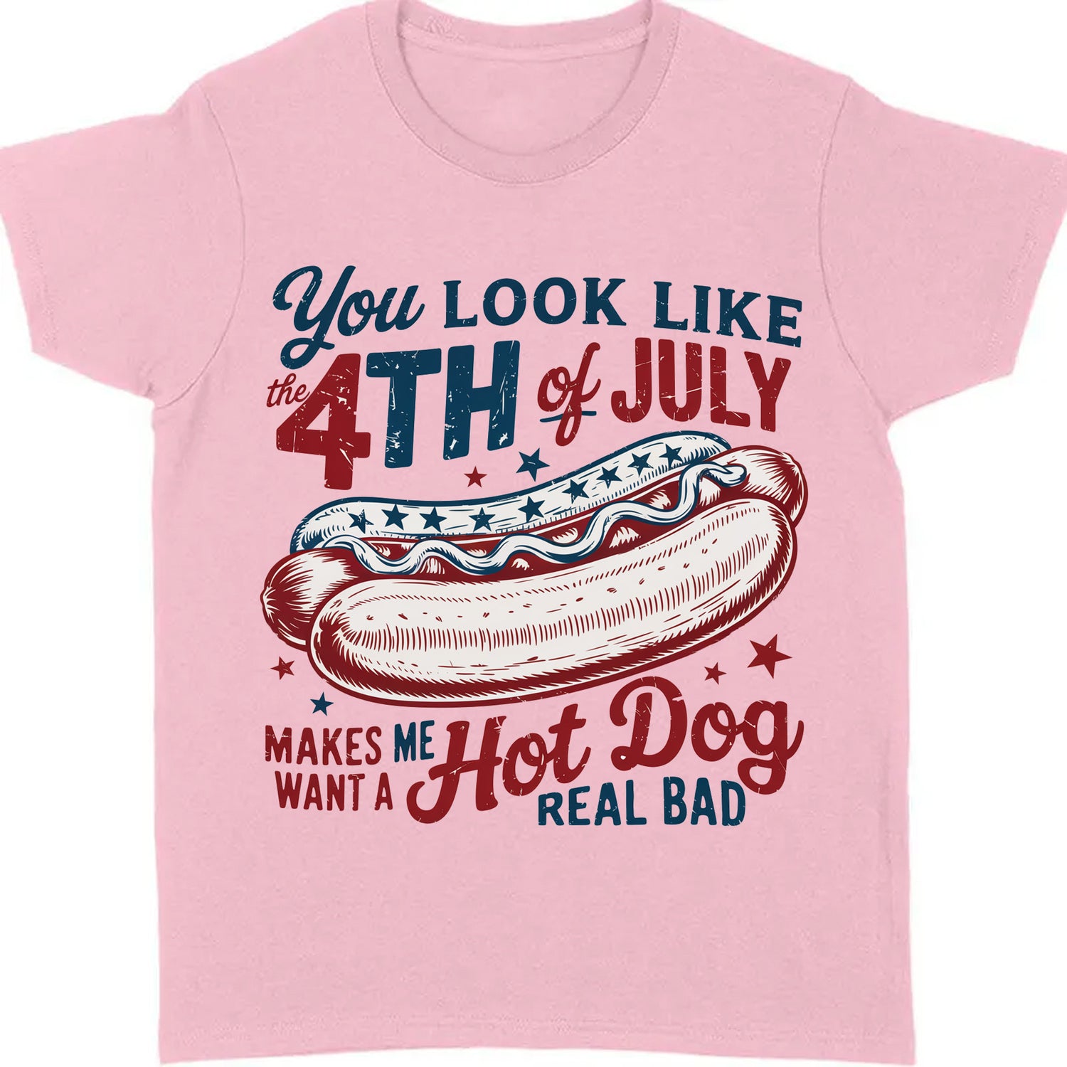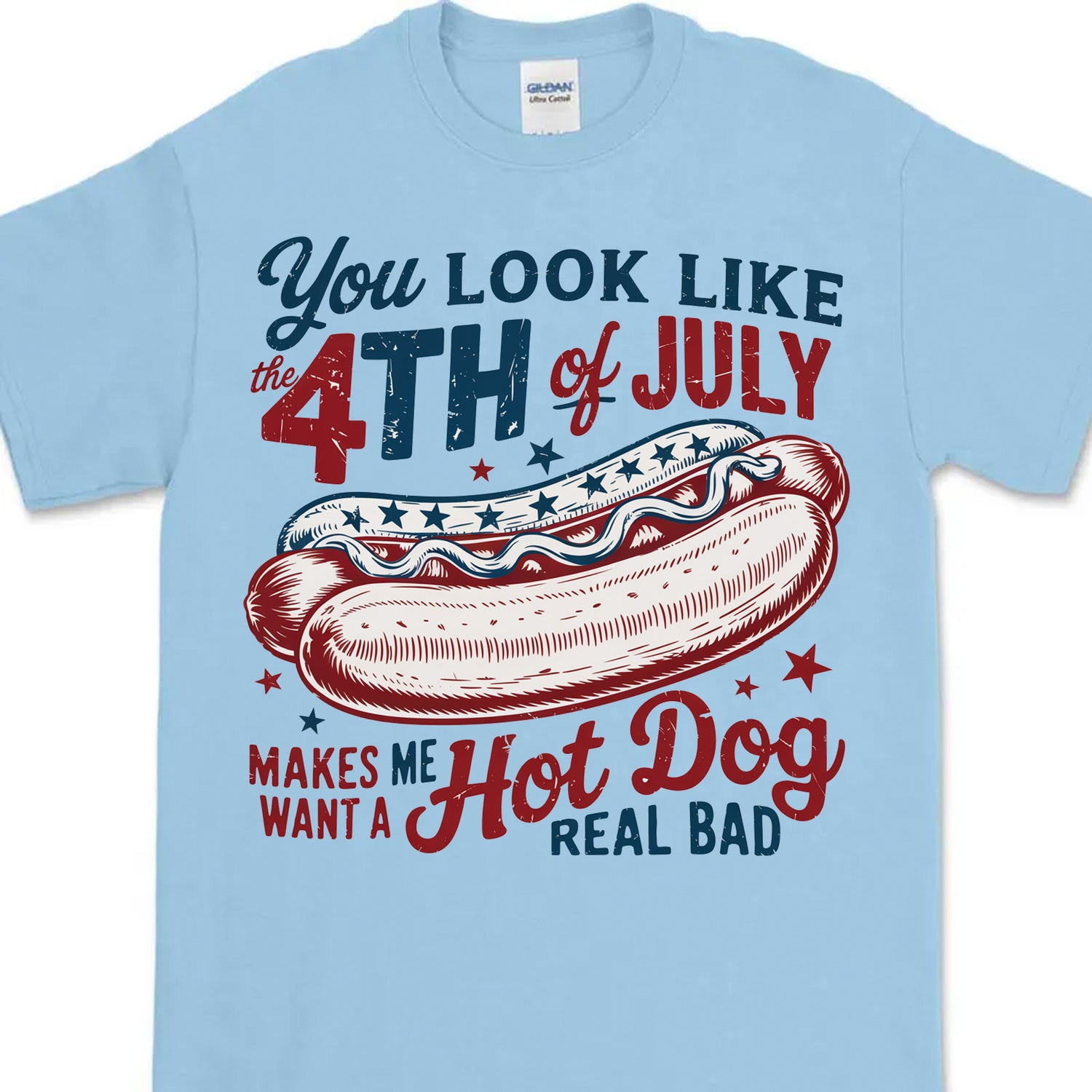 Celebrate your patriotic spirit with humor and style in our "You Look Like the 4th of July" Hot Dog Tee! This playful and eye-catching design features a vintage-style hot dog graphic surrounded by stars and bold red, white, and blue lettering. Whether you’re grilling, chilling, or watching fireworks, this shirt is perfect for the occasion.